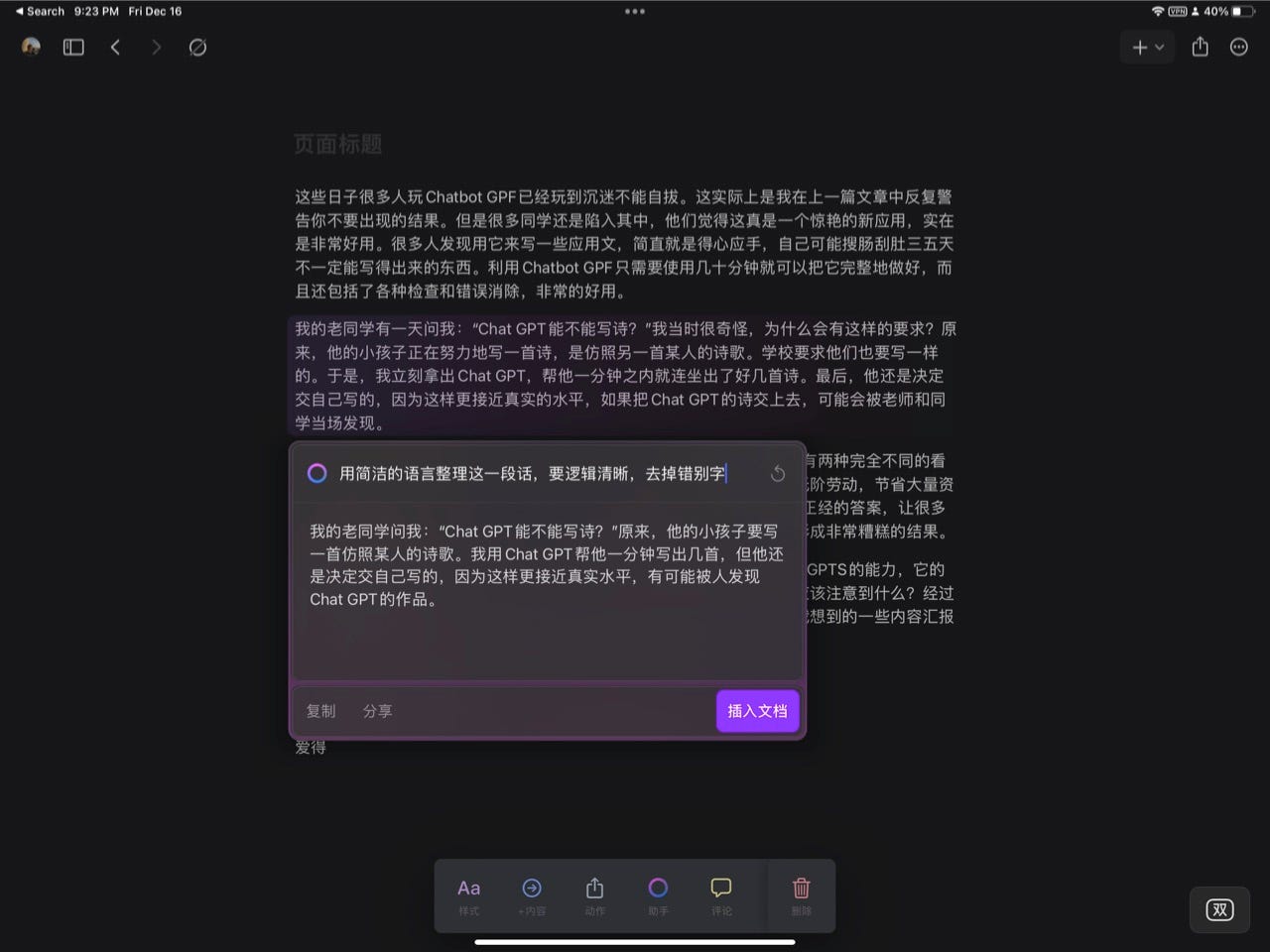 我前些日子对 AI 的自作主张大为头痛,没少进行各种测试。一会儿增加一些要求,一会儿再调整一下文字。Craft 提供的 AI assistant 额度快速消耗,看着真让人心疼啊。后来,我的提示语写得都比转换的段落长了,效果却还不够理想。另外在这样 prompt 要求下 AI 写出来的文字,与我自己的写作风格差异较大,后续也少不了要进行大幅度的修改,想起来就头疼。如果你工作中时常改文章,可能会有共鸣 ------ 改别人的文章,可比自己从头写起来还要费劲许多。
