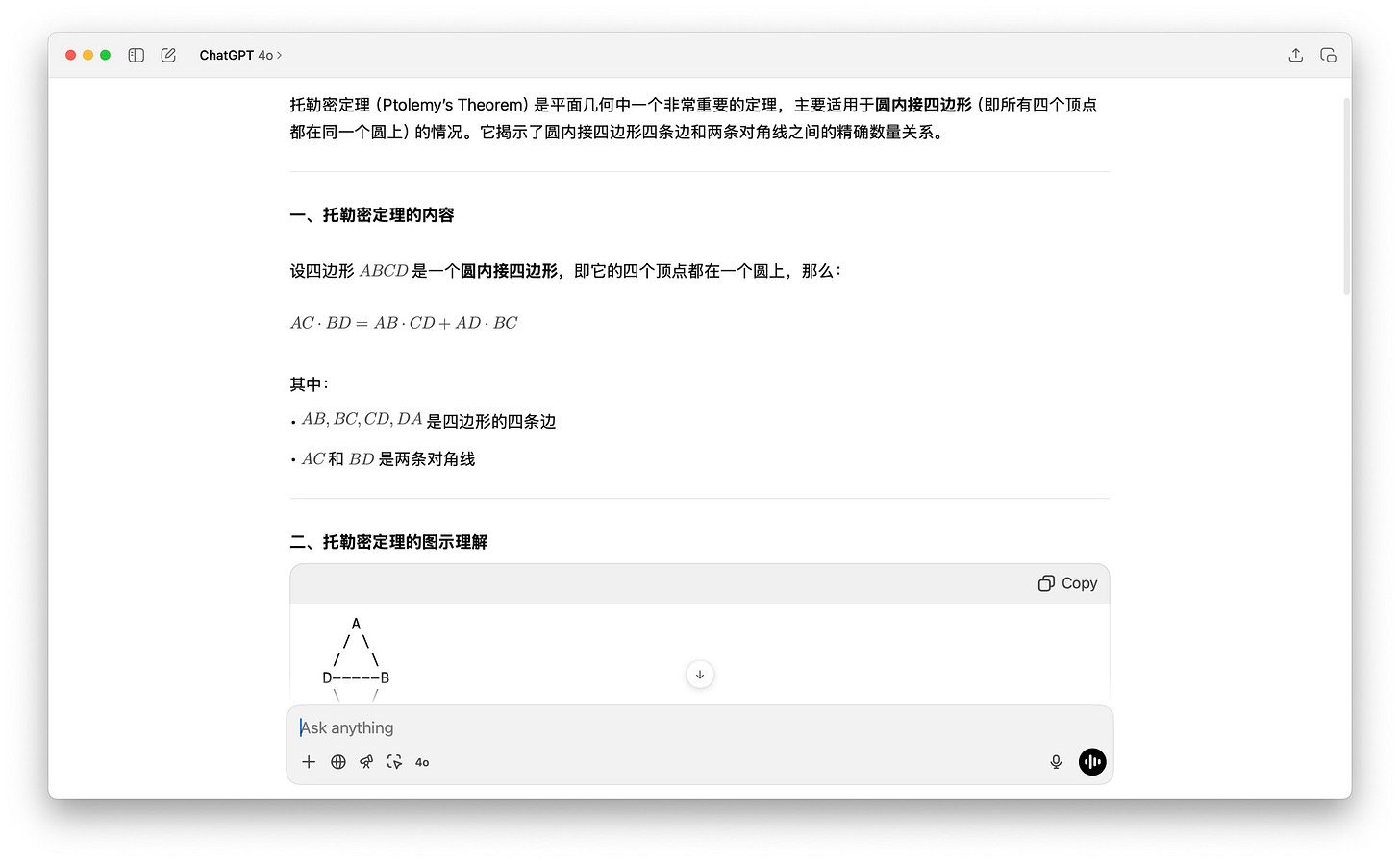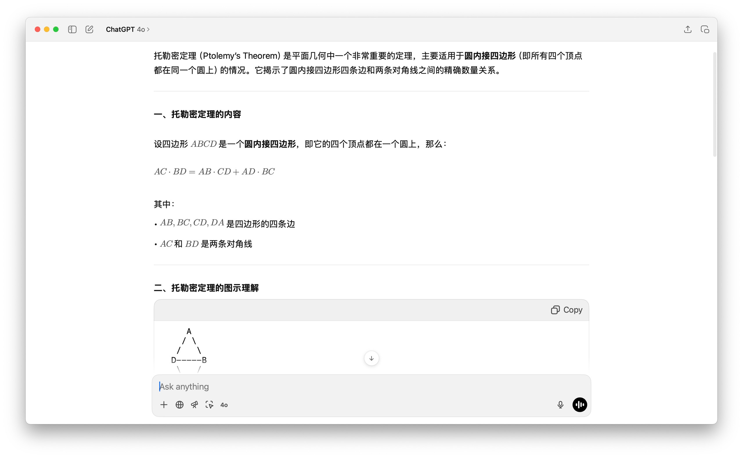 我在 ChatGPT 里面先查看了一下托勒密定理的内容,确认自己没有张冠李戴。