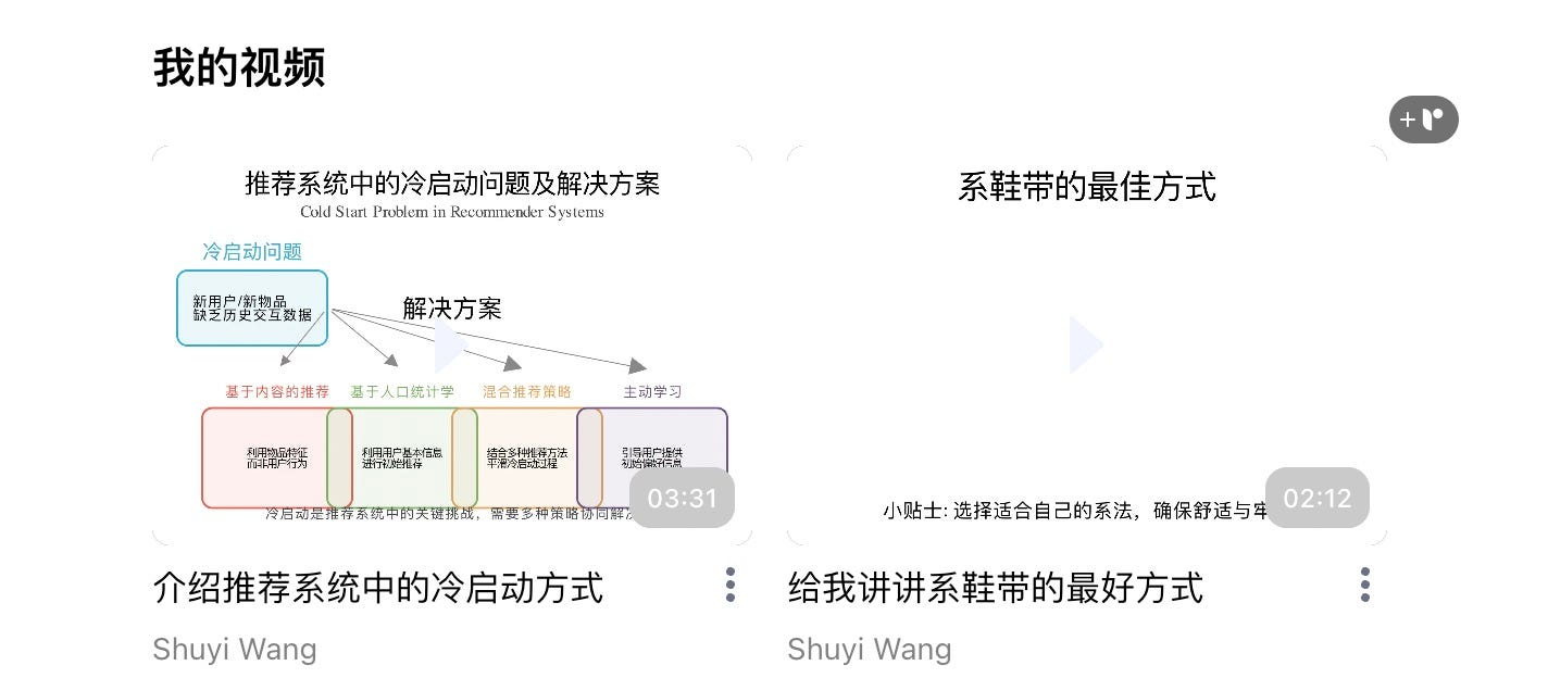 首先,它在一定程度上做到了「因材施教」。对于系鞋带这样的生活技能,它会不厌其烦地讲解每一个步骤。而对于「推荐系统冷启动」这样的专业问题,它则会调用相关的知识组块进行系统性的介绍。对于基础教育中的数学问题,它边讲边画,让学生能够跟上思考。当然,如果我能更明确地指定视频的受众群体(比如是讲给初学者还是有一定基础的人),效果可能会更好。