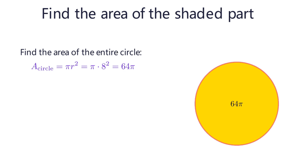 对于 SAT 数学中的几何题,它也能生成步骤清晰的讲解视频。比如一道求解圆形阴影部分面积的题目,视频会引导你先计算整个圆的面积,然后巧妙地将圆比作披萨,分割成若干等份,从而一步步推导出阴影部分的面积。