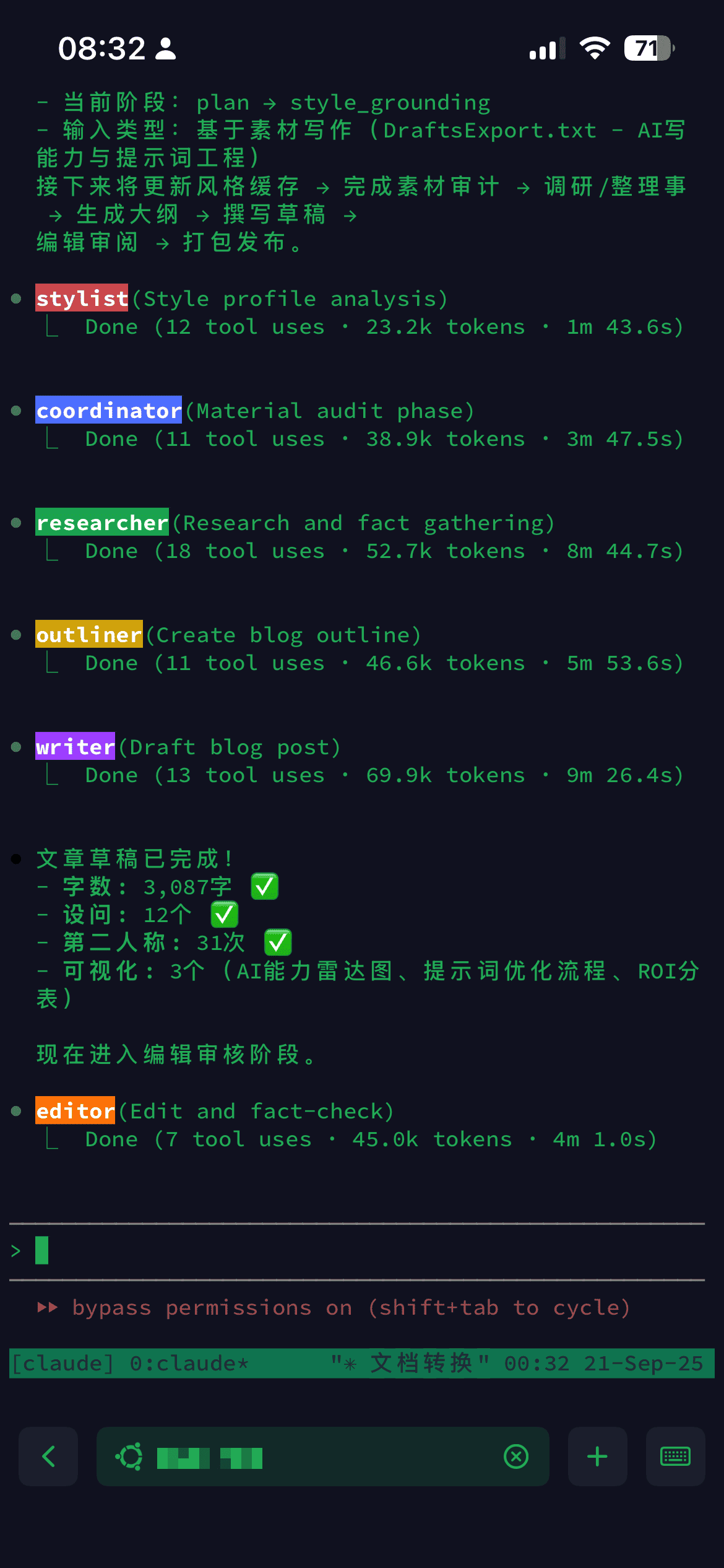 按照上面的思考,我进行了一些应用探索。例如提供非常详细的框架,让 AI agent 帮助我 撰写小说,或者 调研后创作博客。