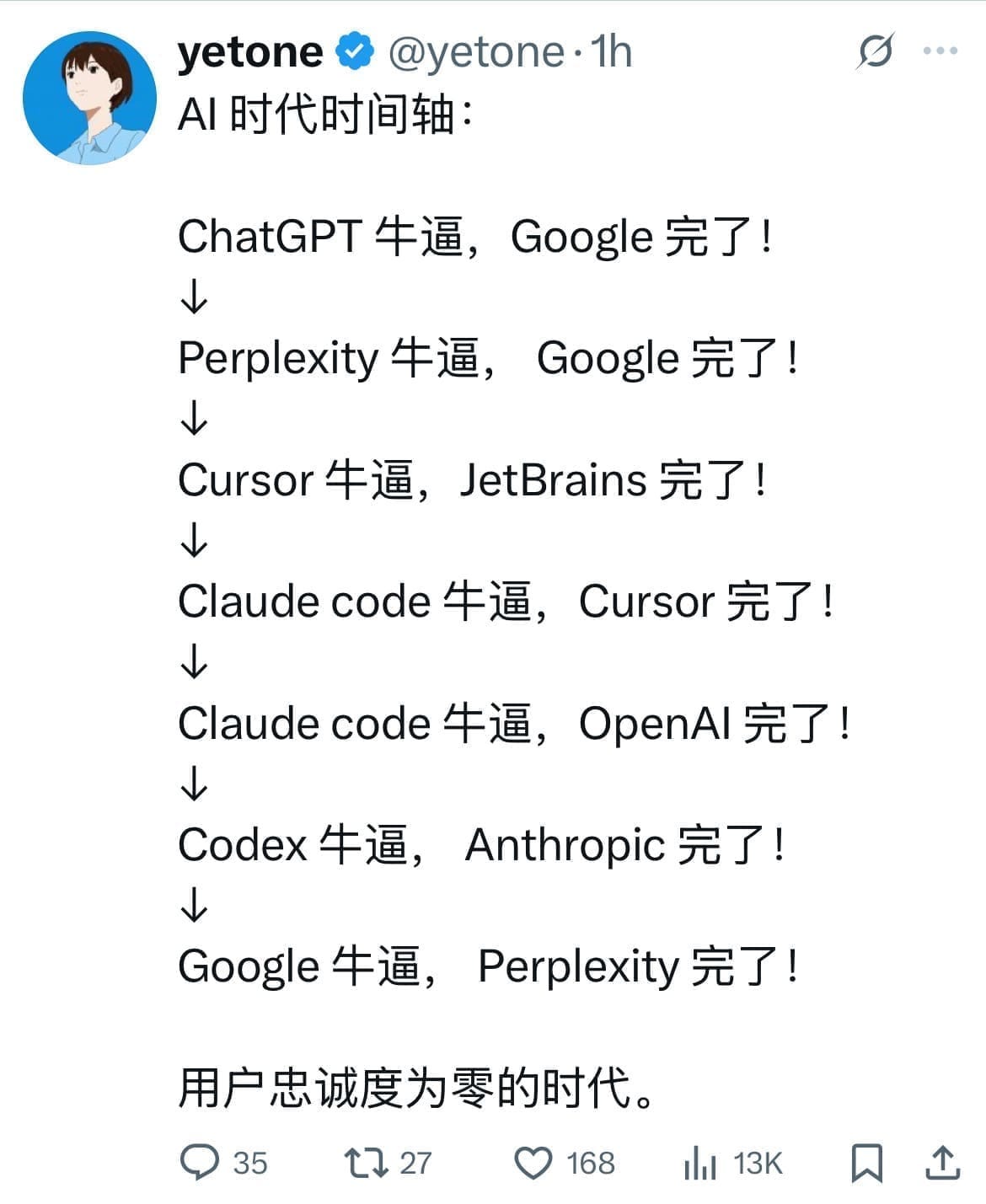 如今你如果为大众提供 AI 产品订阅服务,确实会对这个现象有切肤之痛。但是站在用户的角度,我觉得这是非常理性的举动 —— 你的产品如果不能吸引我,那我立即就转投更好的产品。充分竞争的市场,对用户来说总是好事儿。