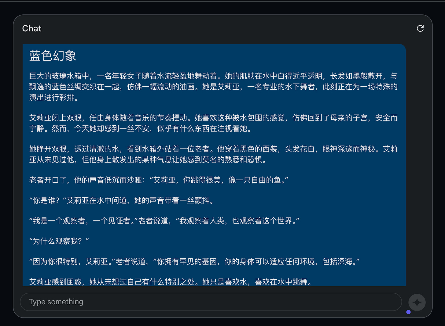 从原理上讲,在对话窗口长度的限制范围内,任何文字内容 Gemini 都可能写出来。但正是因为有了上述系统级提示词的引导,它的回答不再是无聊、平庸的简介,而变成了引人入胜的小故事。这就是提示词发挥的功效——它把一个普通的大语言模型调教成了一个可以通过视频来帮助你进行小说创作的agent。