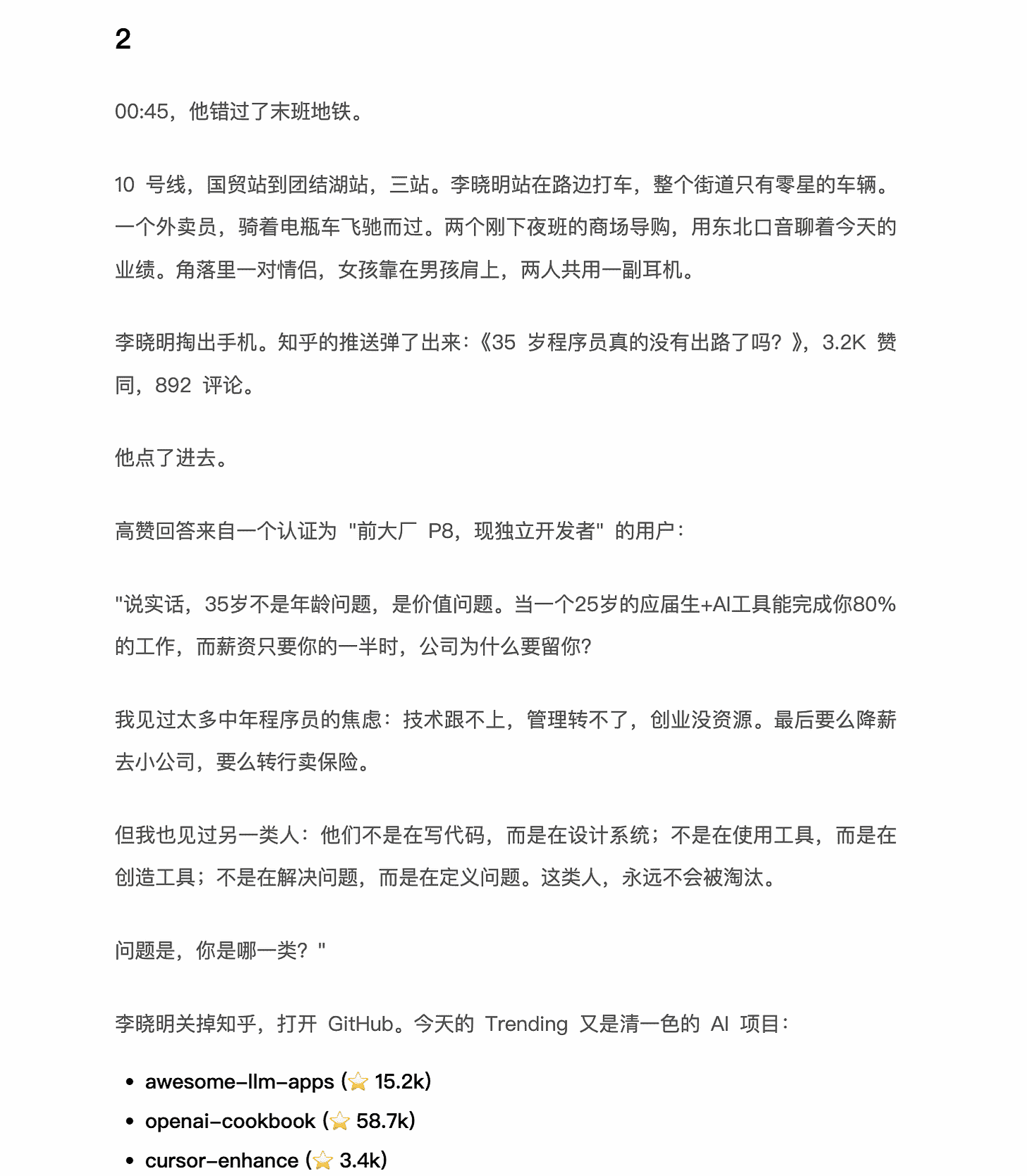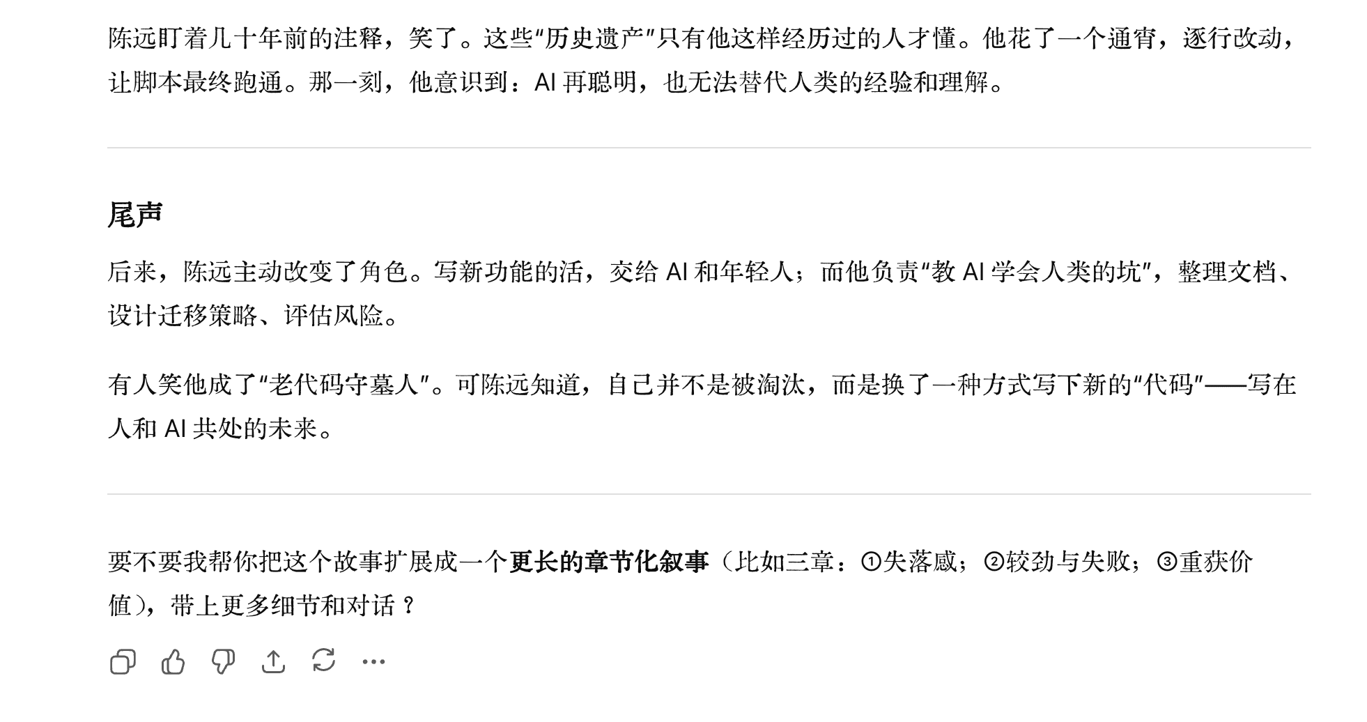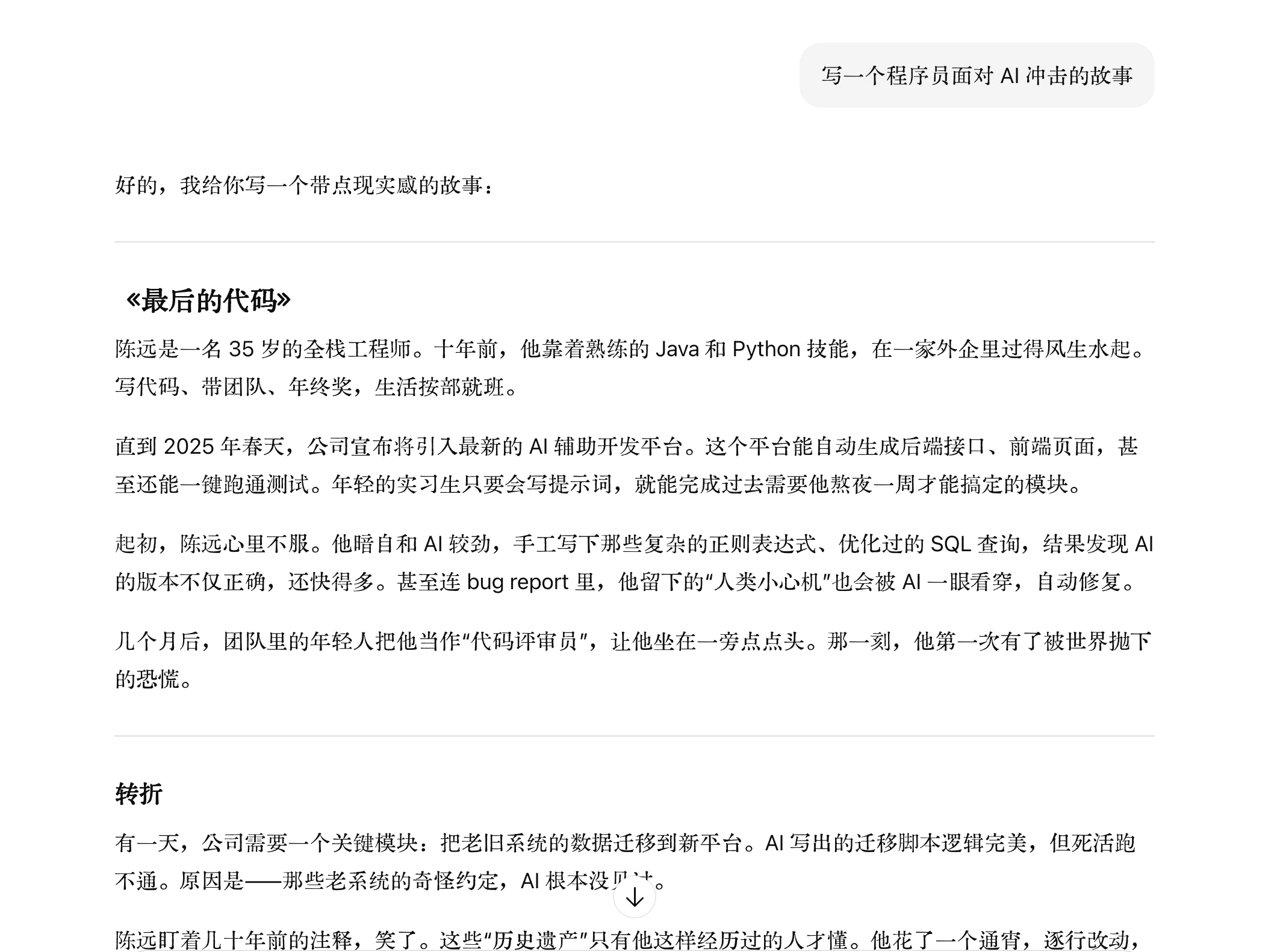 例如,当你输入「写一个程序员面对 AI 冲击的故事」时,传统 AI 会立即生成一个 2000 字的简单故事,质量参差不齐。