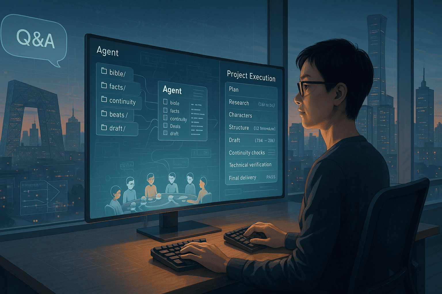 本文我就以这篇小说的创作过程,带你深入理解这种新范式如何通过 50+ 个文件、15 个执行步骤、12 项质量指标,将一个简单的主题转化为两万多字的作品。更重要的是,你将学会如何设计自己的 AI Agent 系统,让 AI 不再是随机的文本生成器,而是可控、可追溯、可迭代的生产力工具。