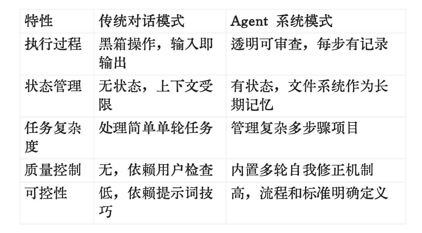 Agent 模式的革命性在于,它将 AI 从一个「回答问题的工具」转变为一个「执行项目的系统」。这就像从「向朋友征求建议」升级到「花钱聘请专业团队完成项目」。通过提供结构化的流程(提示词)和持久化的记忆(文件系统),Agent 才突破了 AI 的上下文限制,获得了处理复杂任务的能力。