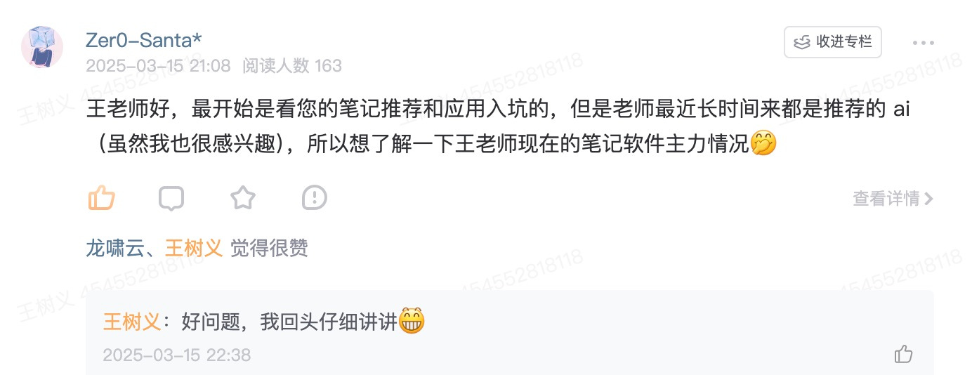 前几天我在星球里收到了星友 ZerO-Santa 的留言。他说之前是因为看了我写的很多关于笔记效率工具的文章才加入了星球。尽管对我最近一直聊的 AI 很感兴趣,ZerO-Santa 还是挺好奇我现在具体还在用哪些笔记工具。