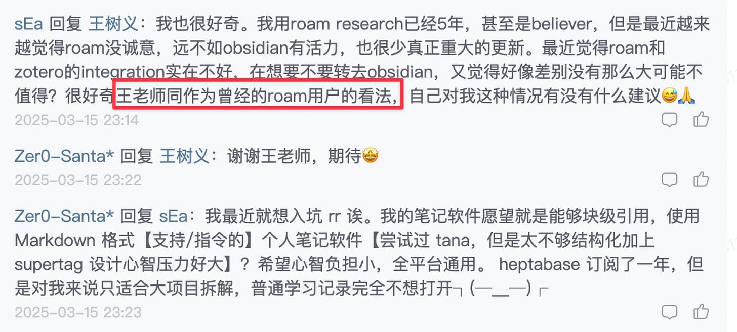 我觉得这个问题问得特别好,决定写一篇文章仔细讲。不过当我去留言区瞅了瞅,看到有小伙伴说:「作为曾经的 Roam Research 用户,王老师如何如何……」