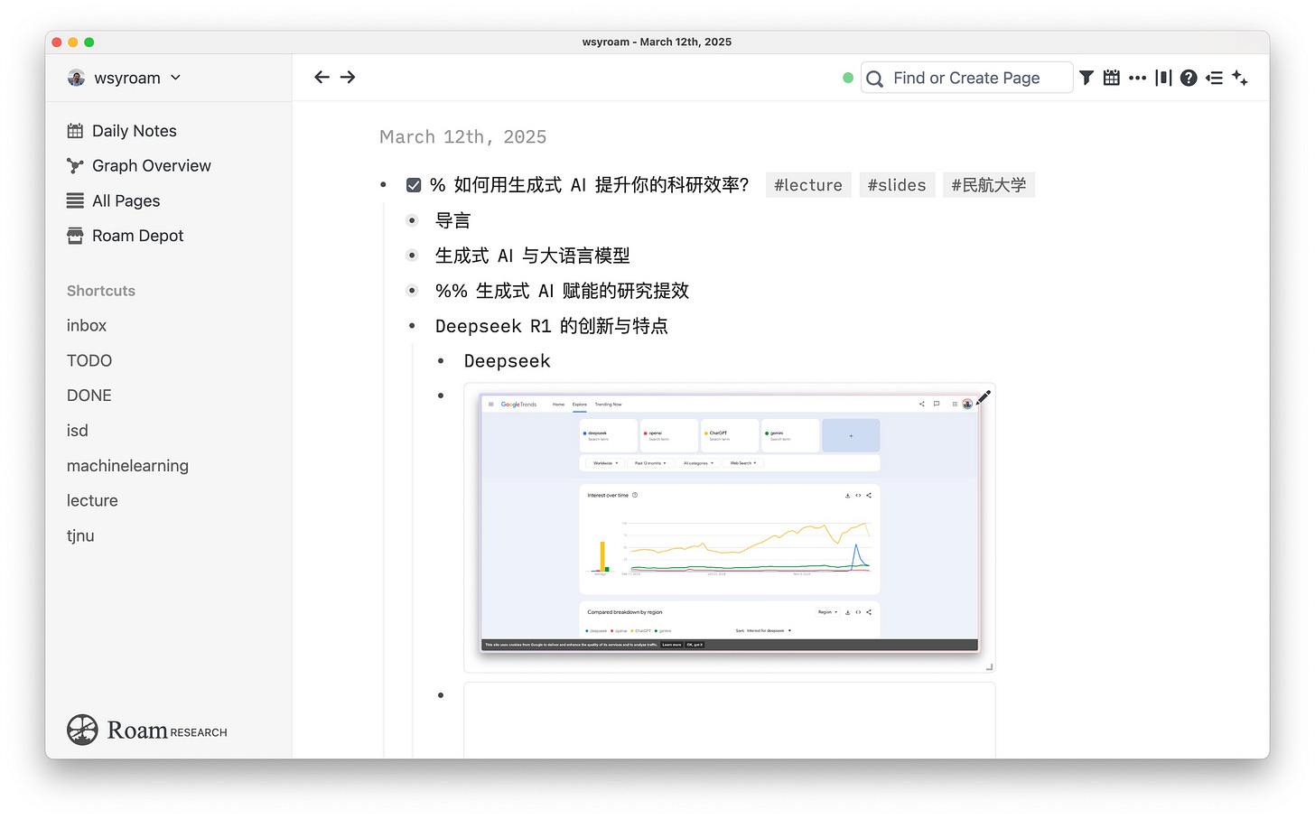你看,这是我前几天去中国民航大学做讲座前,用 Roam Research 做的幻灯讲义。