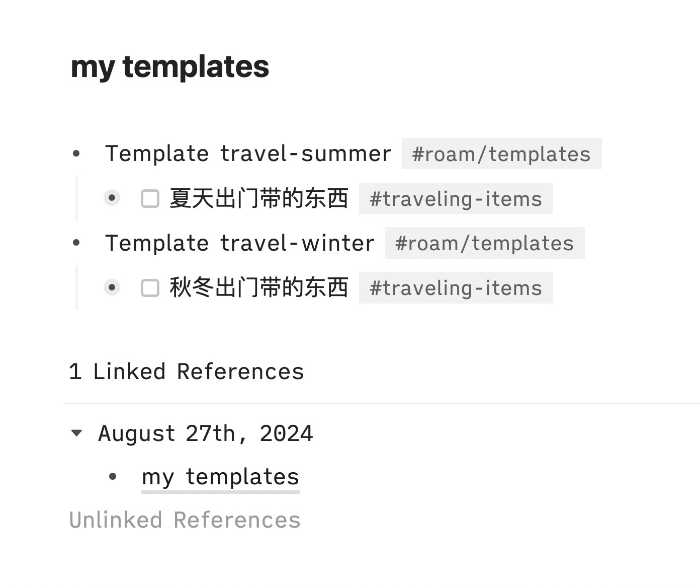 不过,我现在使用 Roam Research,确实已经「轻」到了令人发指的地步 —— 只限于做幻灯,以及每次出差前用模板列个出行清单,以便逐条打钩。