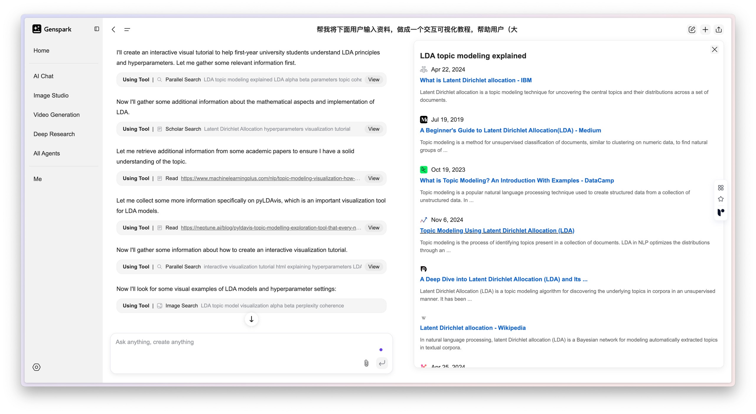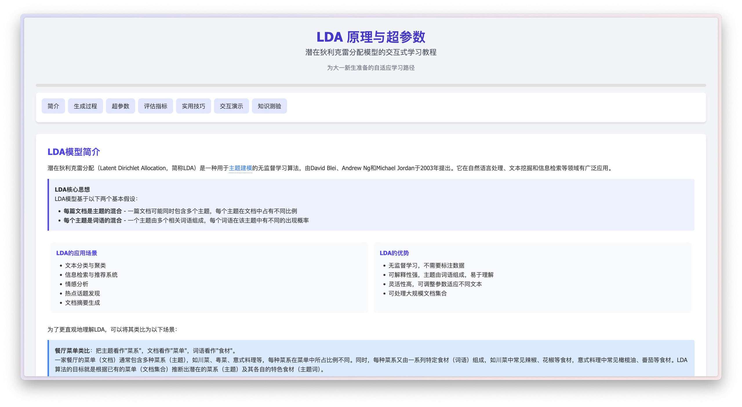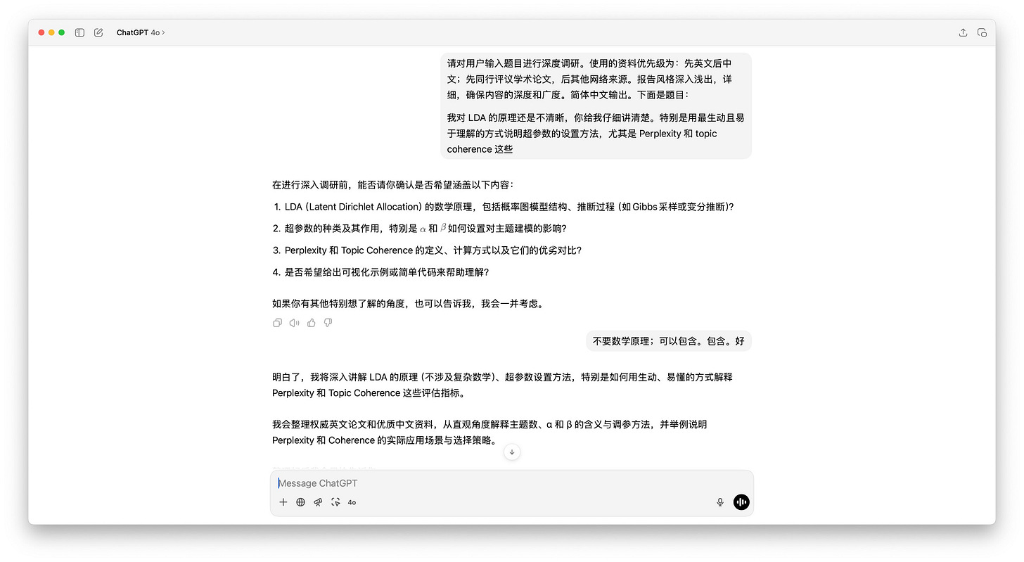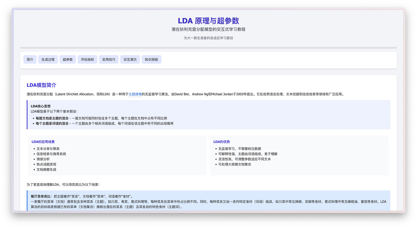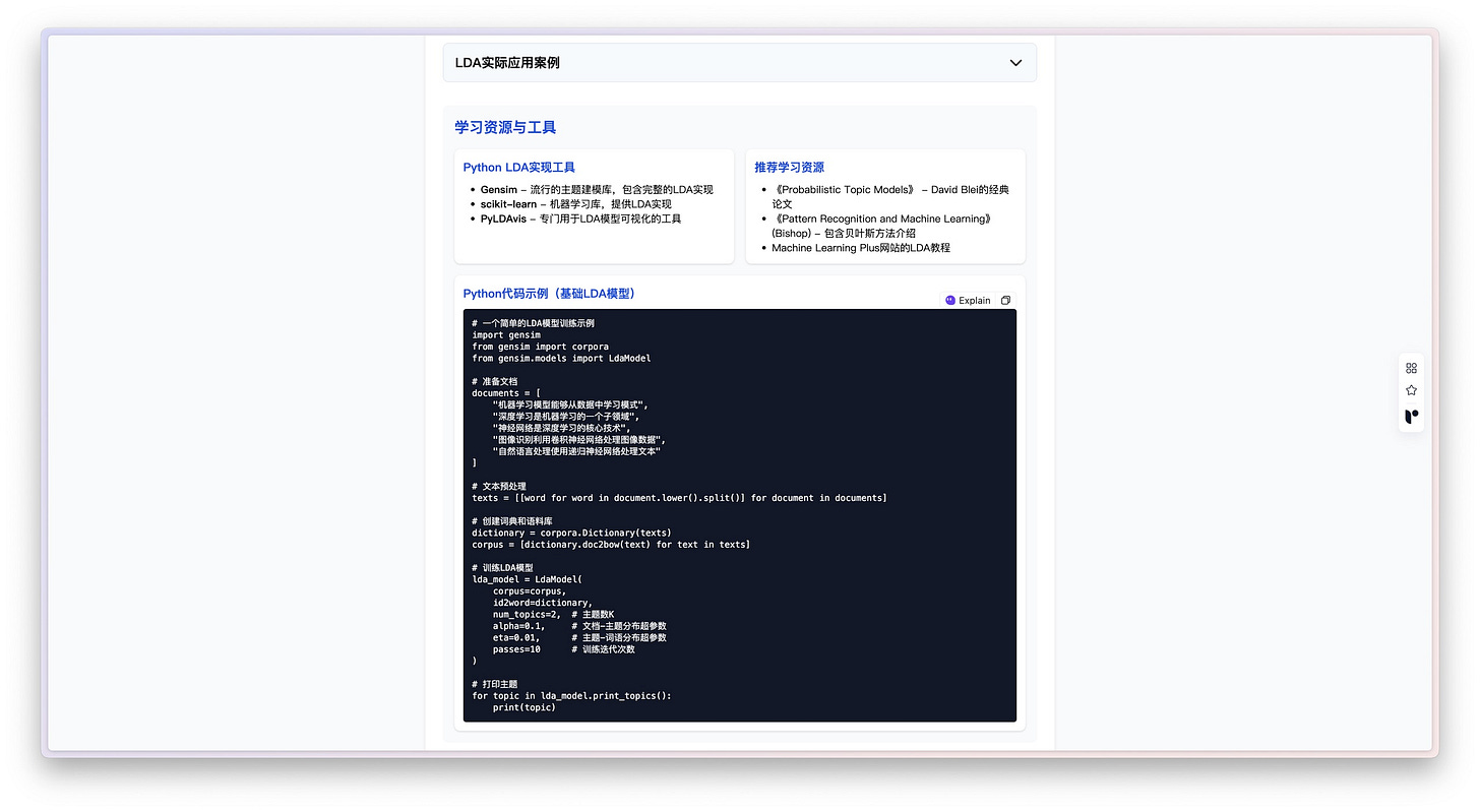 首先,它就像我们平时做研究一样,到网上搜索大量和 LDA 有关的背景资料,比如一些入门教程、详细文章,还有图表和可视化工具。