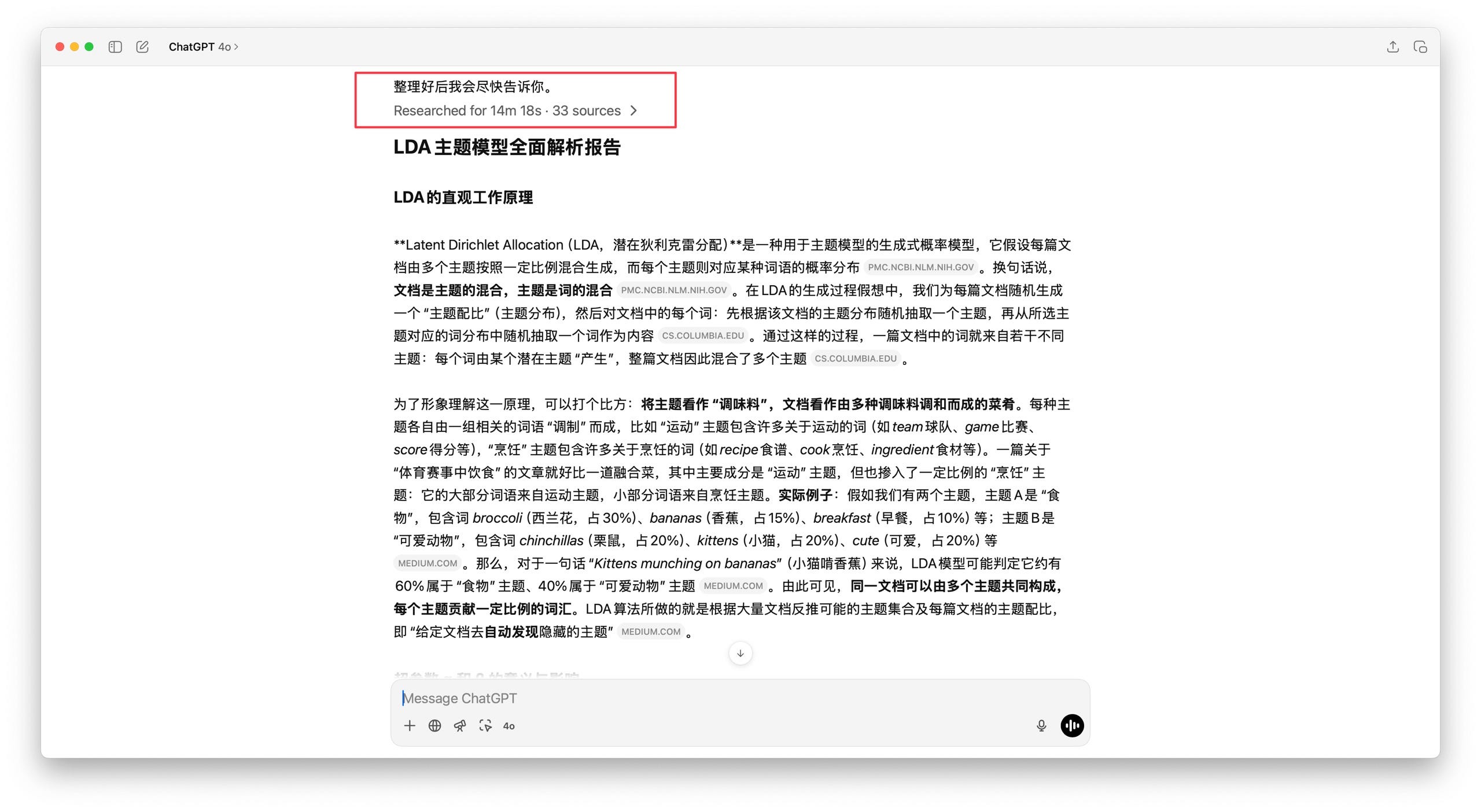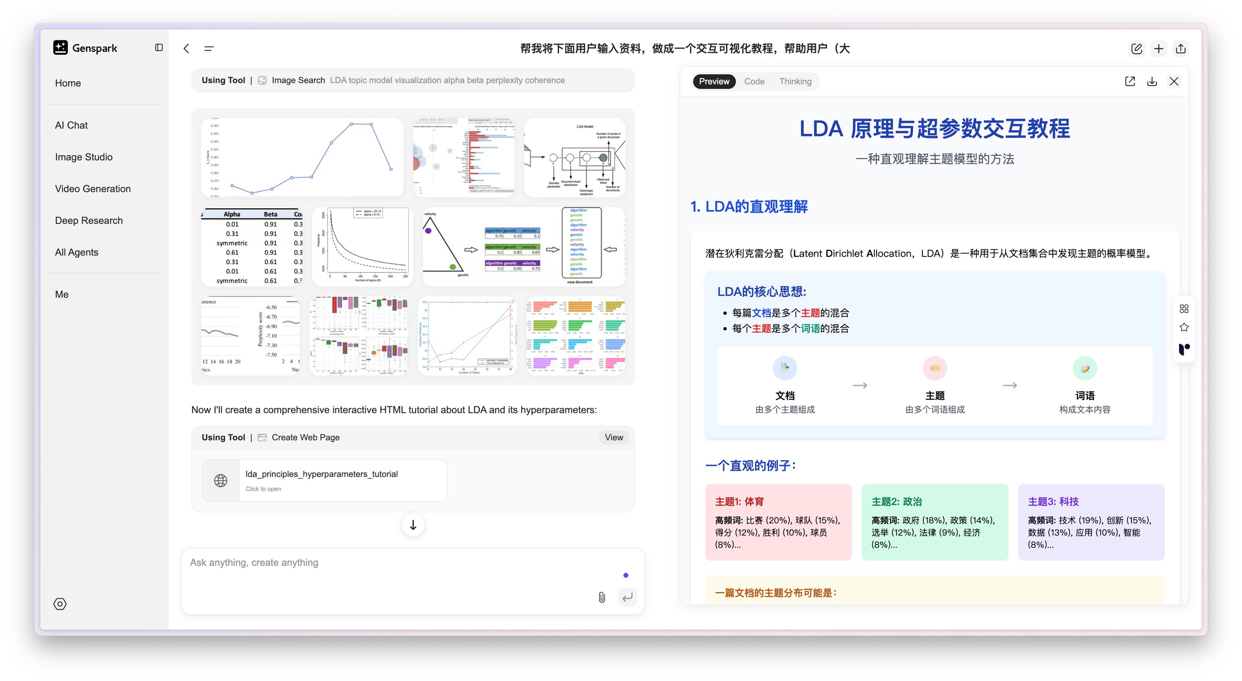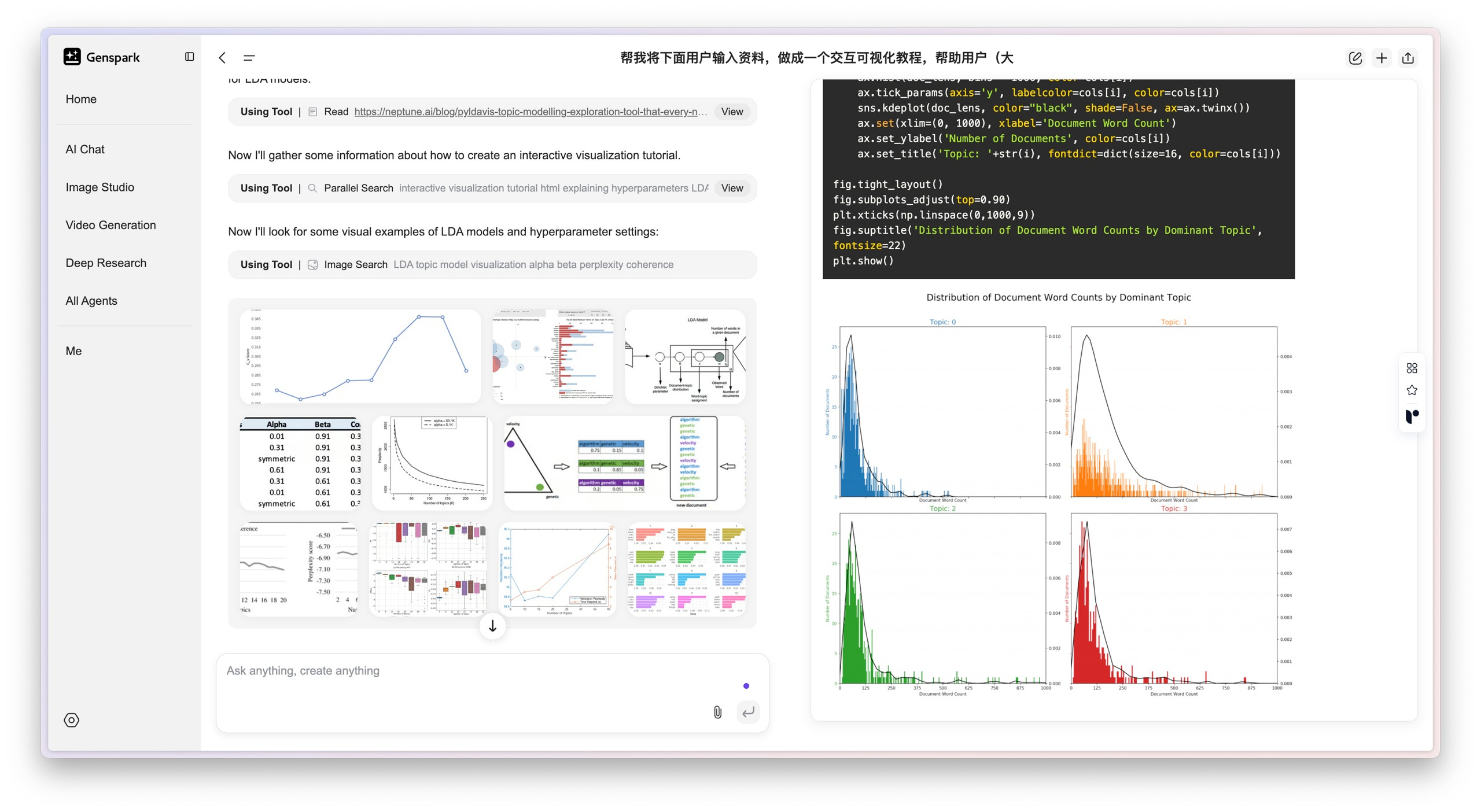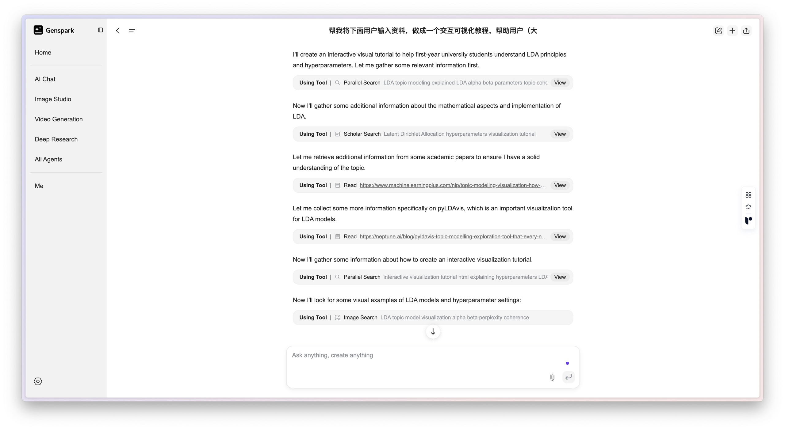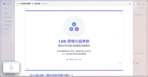 首先,它就像我们平时做研究一样,到网上搜索大量和 LDA 有关的背景资料,比如一些入门教程、详细文章,还有图表和可视化工具。