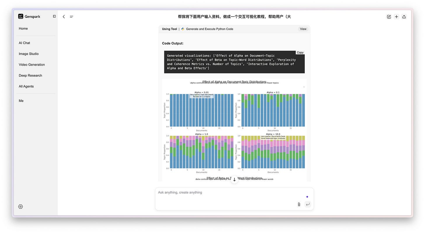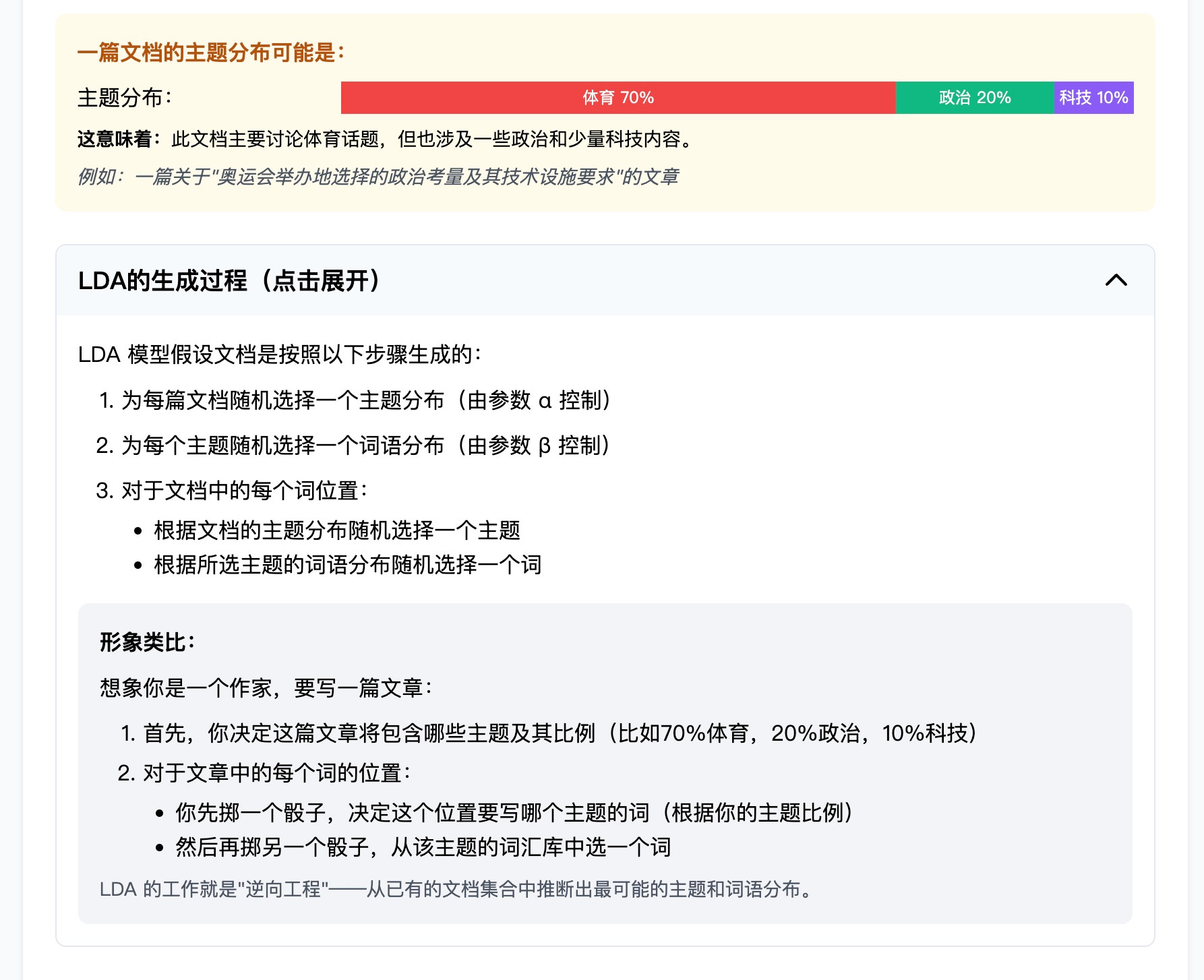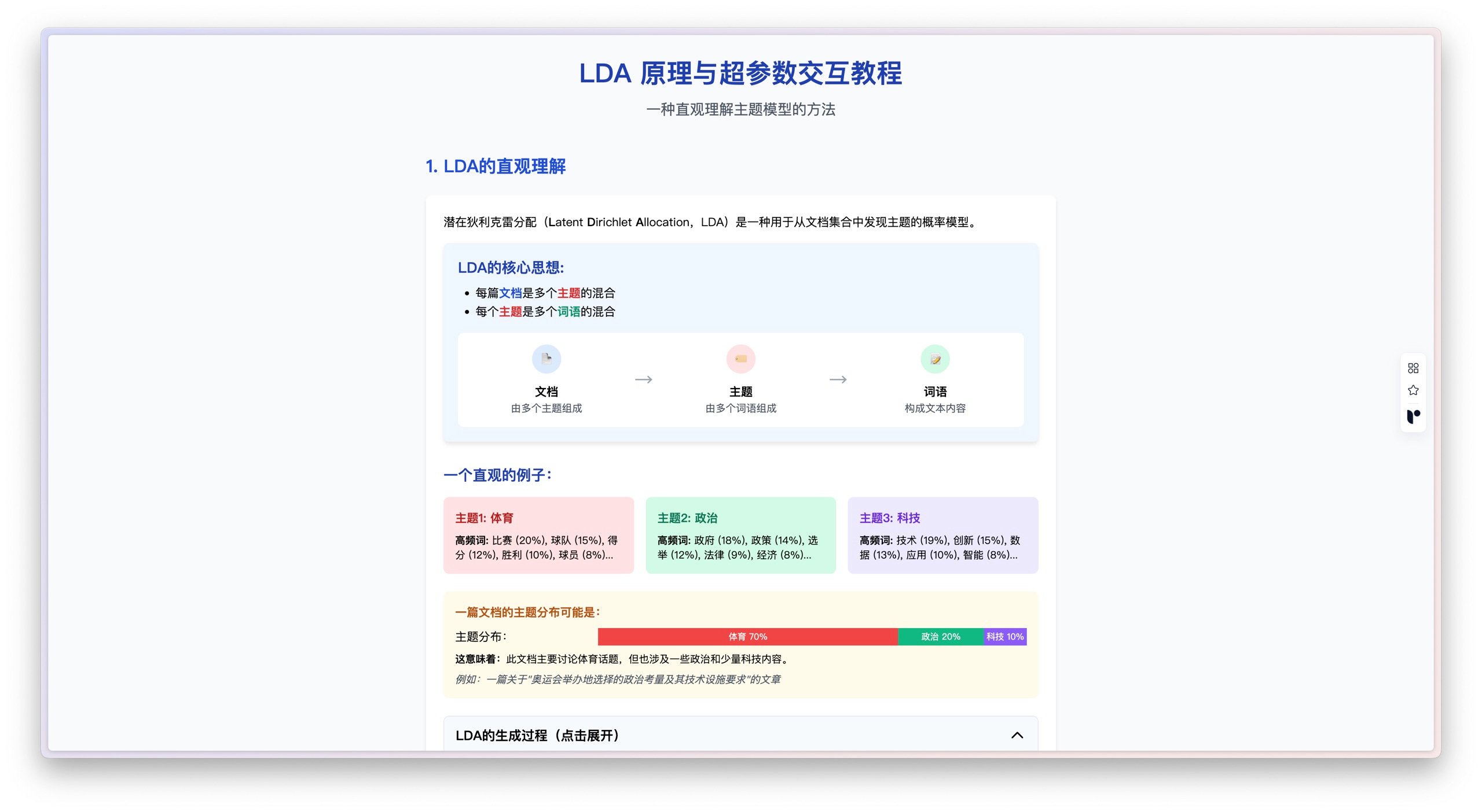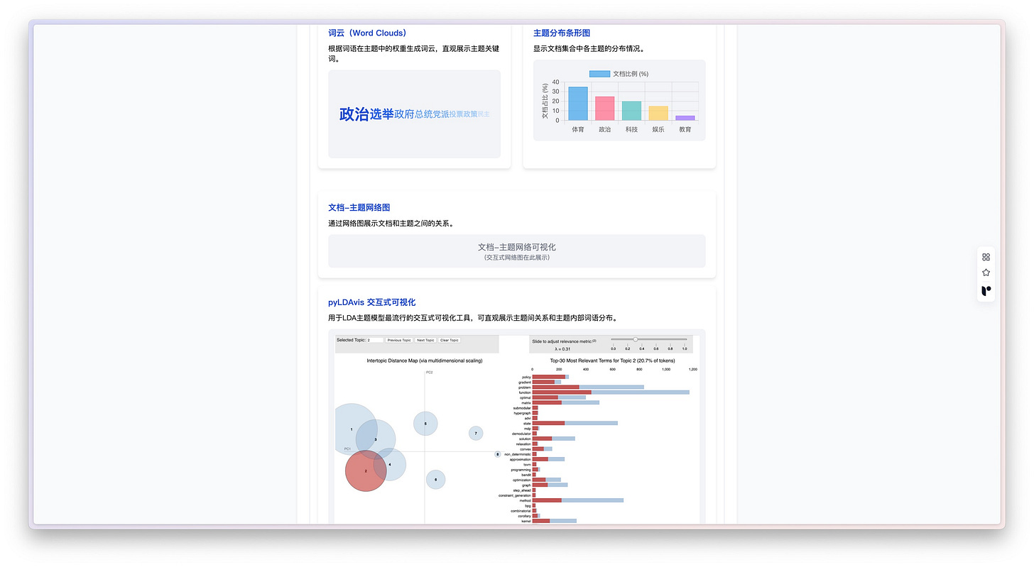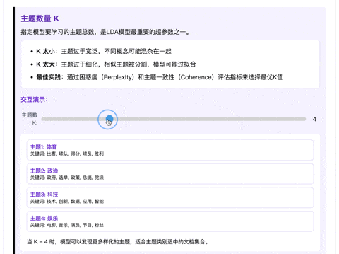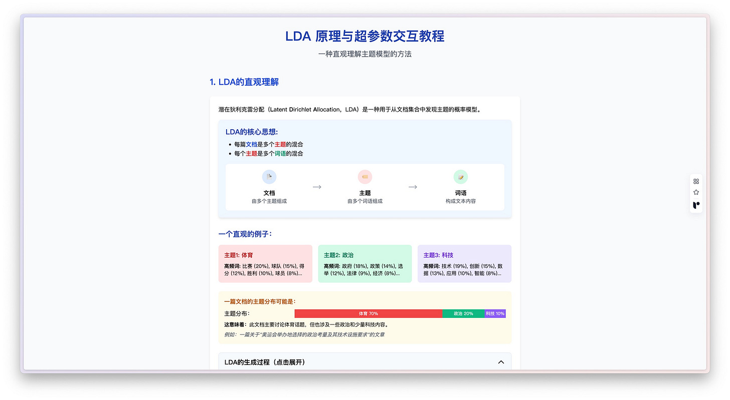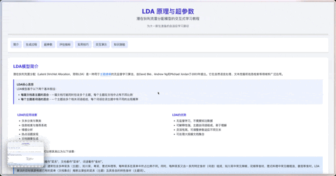 这种实时交互、即时反馈的体验,真有种做实验的感觉,能让你深入理解 LDA 模型的运行机制。