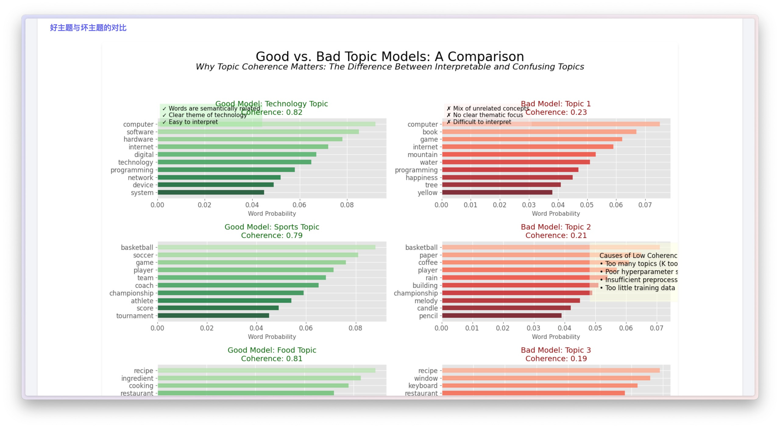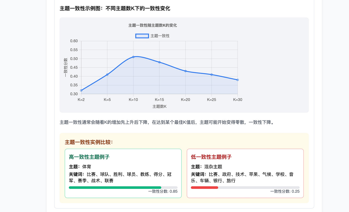 主题一致性则讲解得更为生动 —— 高一致性的主题里,词语之间都密切相关(比如体育主题就会出现「比赛」「得分」这样的词),低一致性的主题则会混乱不堪,比如「苹果」「政府」「气候」啥都有。
