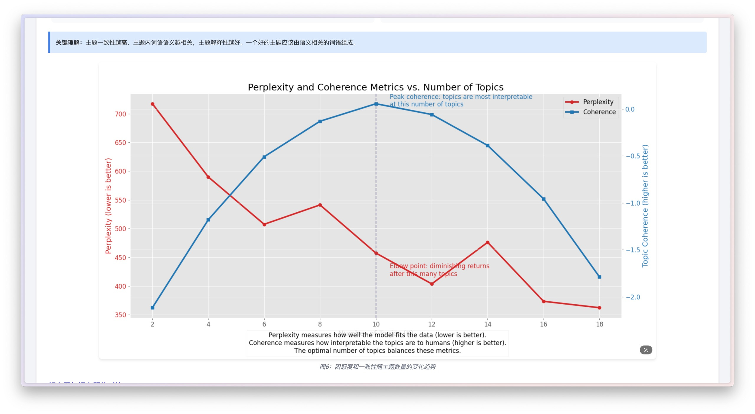而困惑度和一致性的说明部分也一样,全用自己 Python 编码生成的高质量图表来展示。