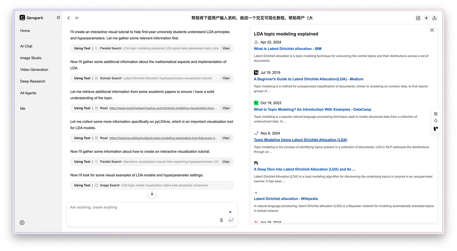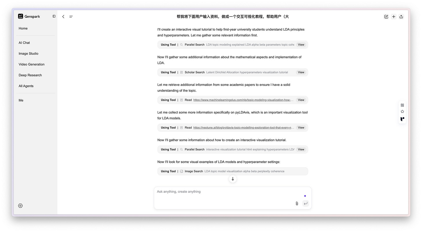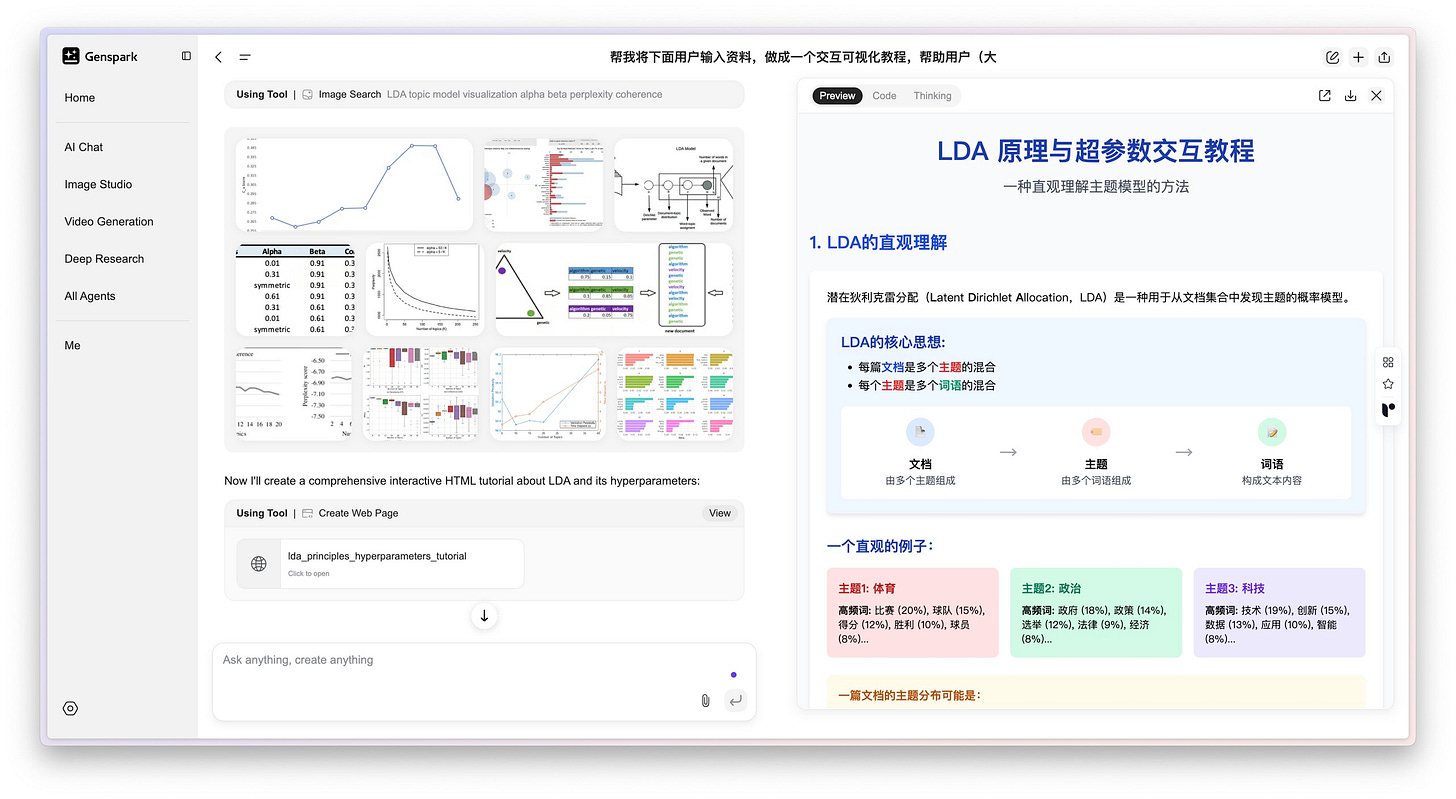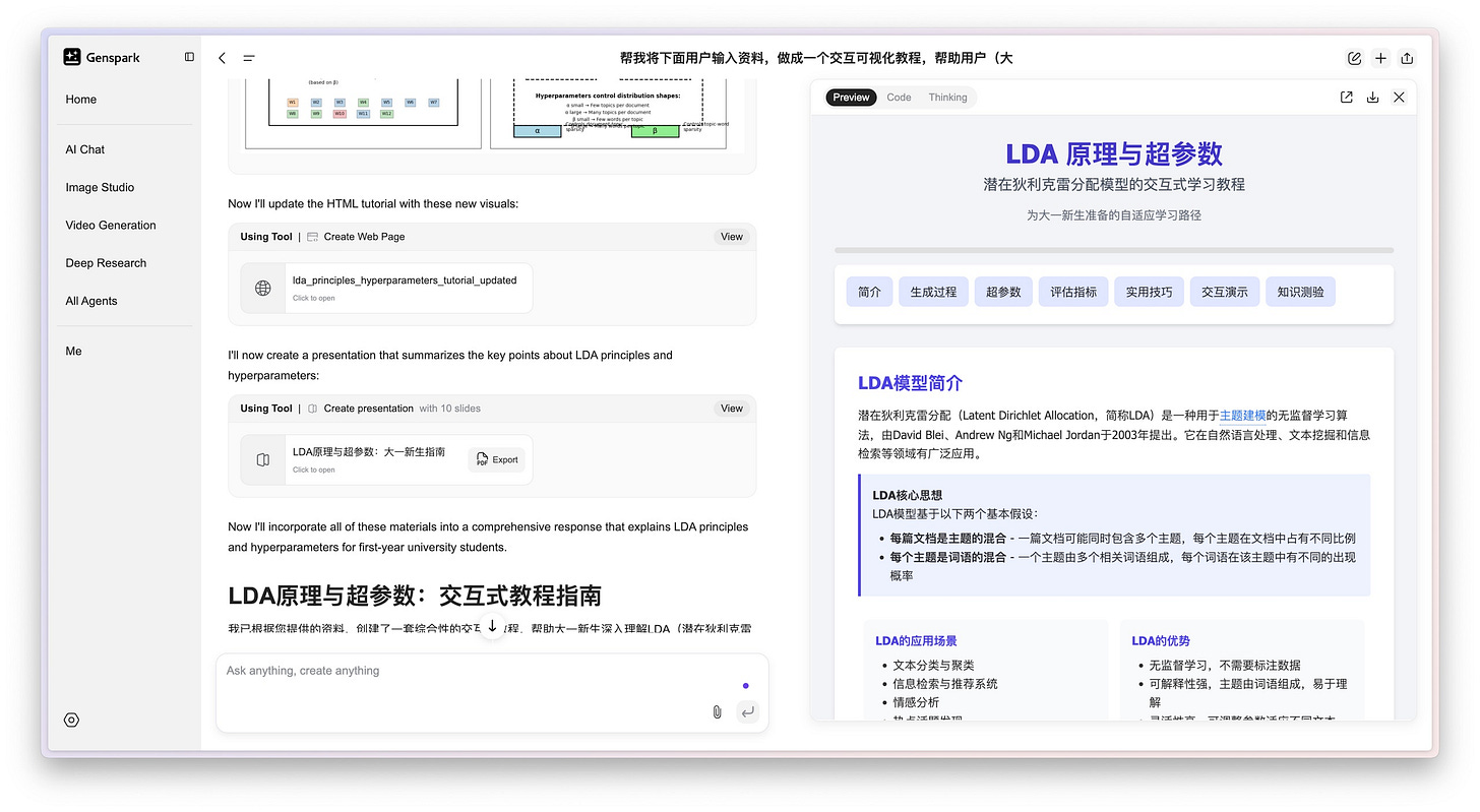于是我又找来了帮手,一个叫 Genspark 的 AI 工具,明确跟它提出了一个需求:「帮我把下面这些对话记录制作成一个交互式的可视化教程,好帮助用户,比如刚入大学的新生,更好地理解。」