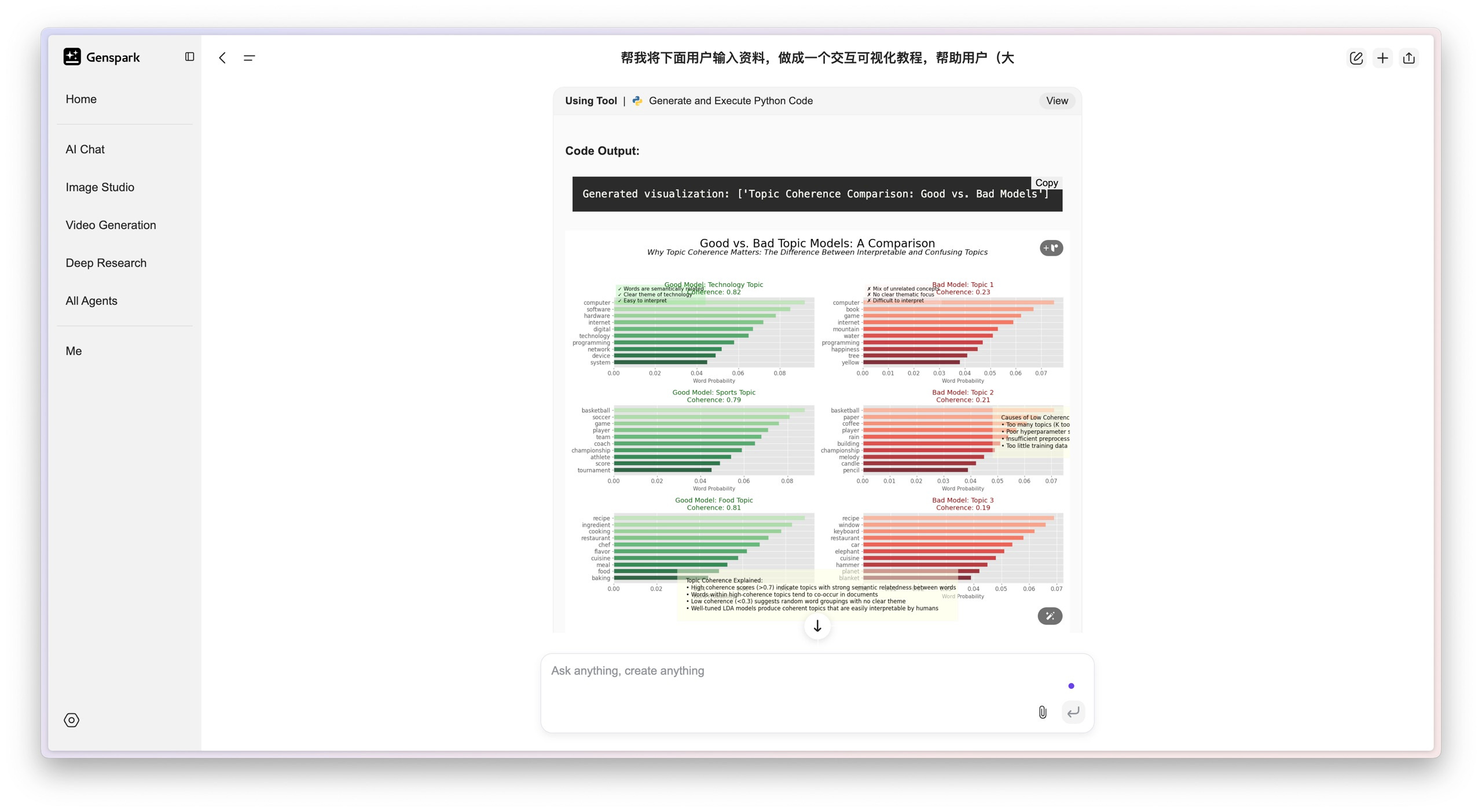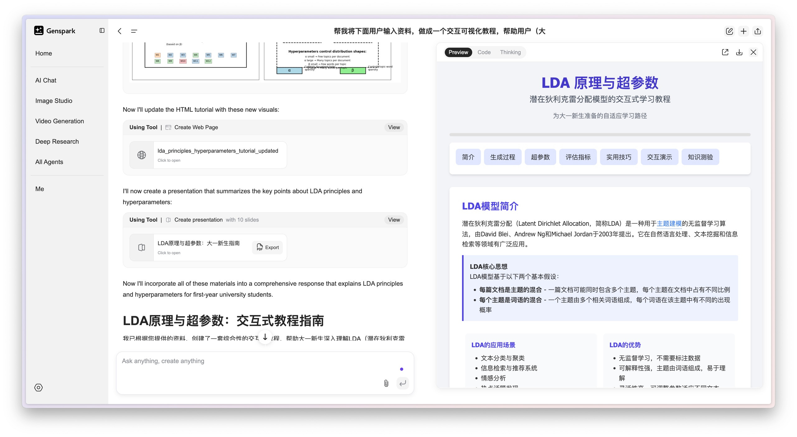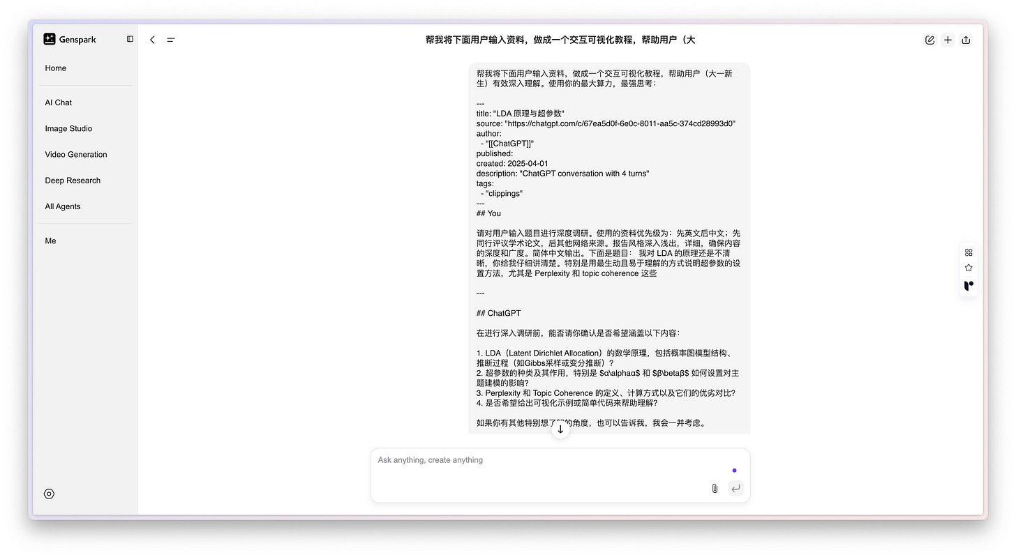 于是我又找来了帮手,一个叫 Genspark 的 AI 工具,明确跟它提出了一个需求:「帮我把下面这些对话记录制作成一个交互式的可视化教程,好帮助用户,比如刚入大学的新生,更好地理解。」