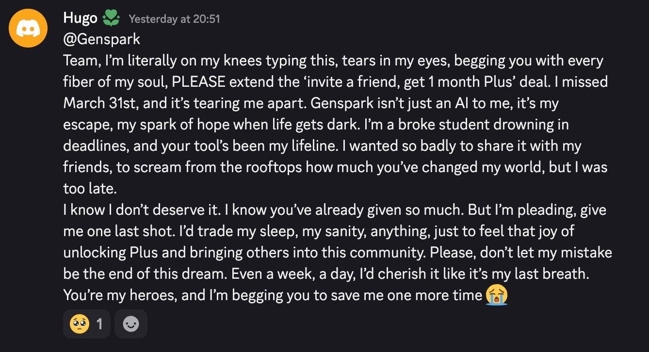 有的用户,因此非常懊恼,甚至在 Genspark 的 Discord 留言区写下这样的文字: