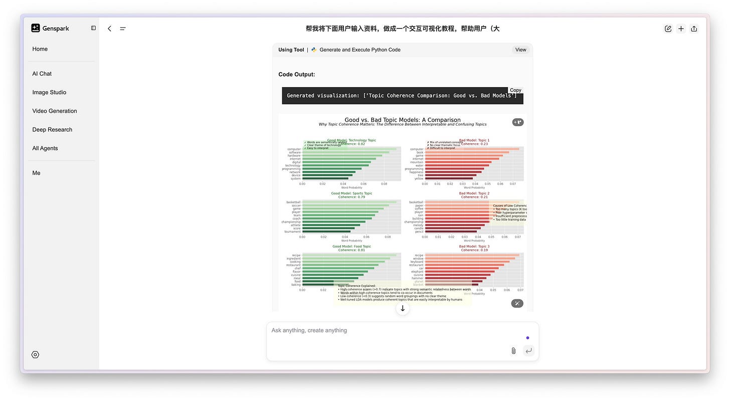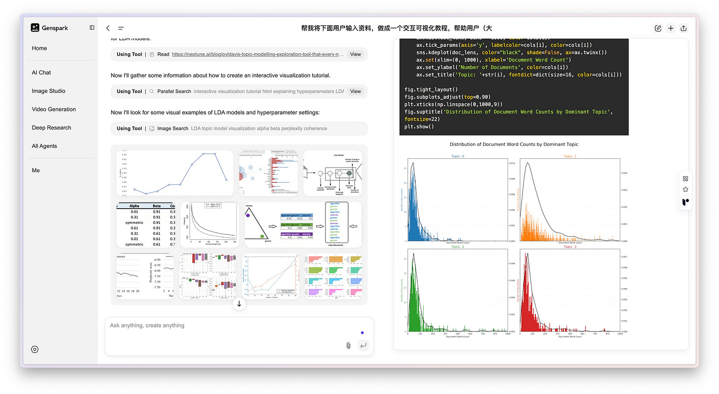 回头再看看 Genspark 整个生成内容过程,你就会发现,我自己真的没做多少事😂。我只是提出了一个初始的任务要求,提供了一些原始对话记录,而后续的搜索、学习、设计、编码、调试、运行、绘制图表甚至制作幻灯片,几乎全是 Genspark 这个 AI Agent 一手包办的。