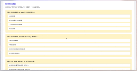 教程最后还专门设计了一个知识小测验,比如「Alpha 参数控制的是什么?」「困惑度低意味着什么?」等等,通过几个互动问答,你就能快速检验自己掌握得怎么样了。