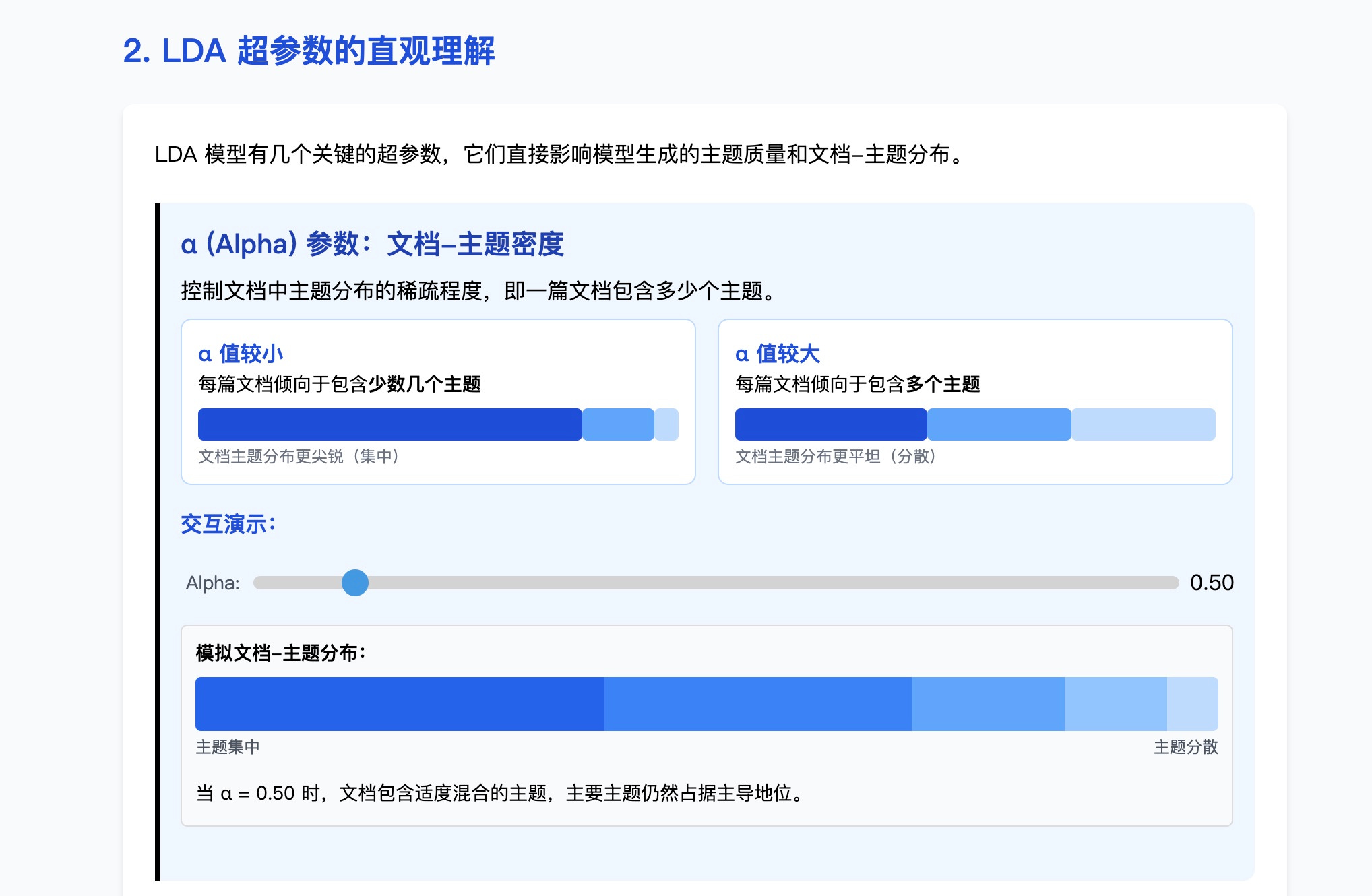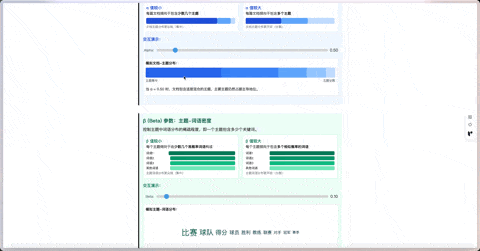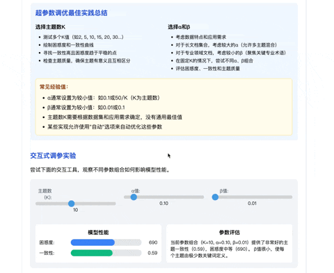 再往下,是关于 Alpha 和 Beta 超参数的核心讲解部分。这里有个特别贴心的设计:两个可以随意拖动的滑块。当你动手调节 Alpha 或 Beta 时,旁边的图表会实时地跟着变化,清楚地展示不同参数如何影响主题和词语的分布效果。Alpha 究竟是大点好还是小点好?Beta 变化意味着什么?你只需要亲手试试就明白了。