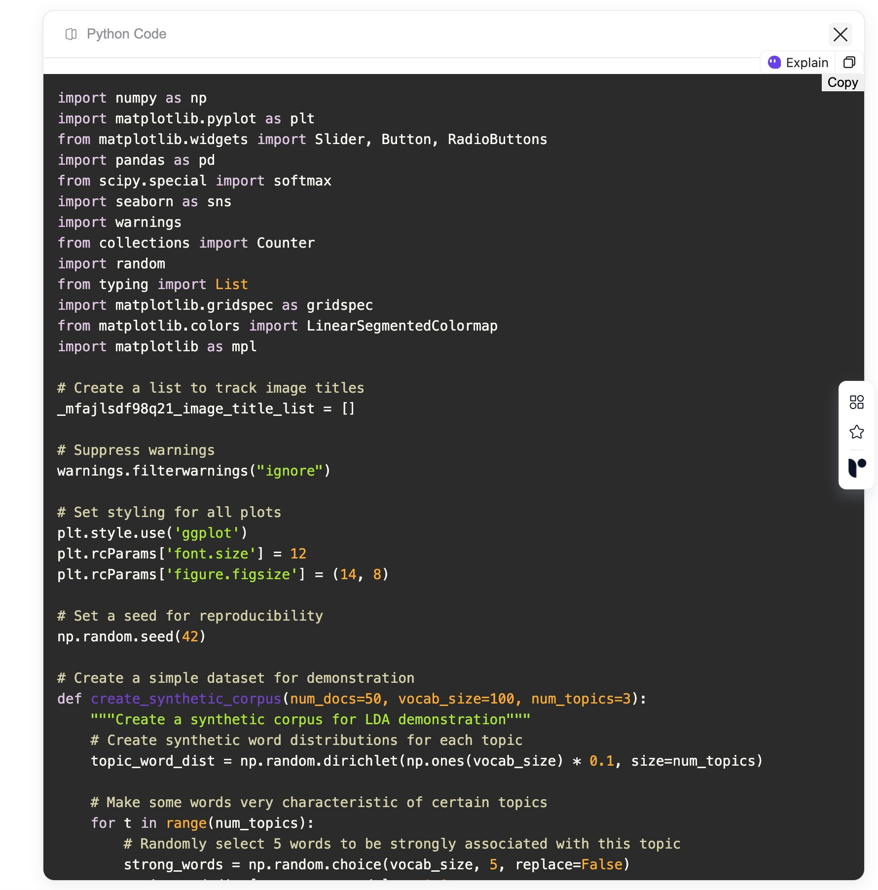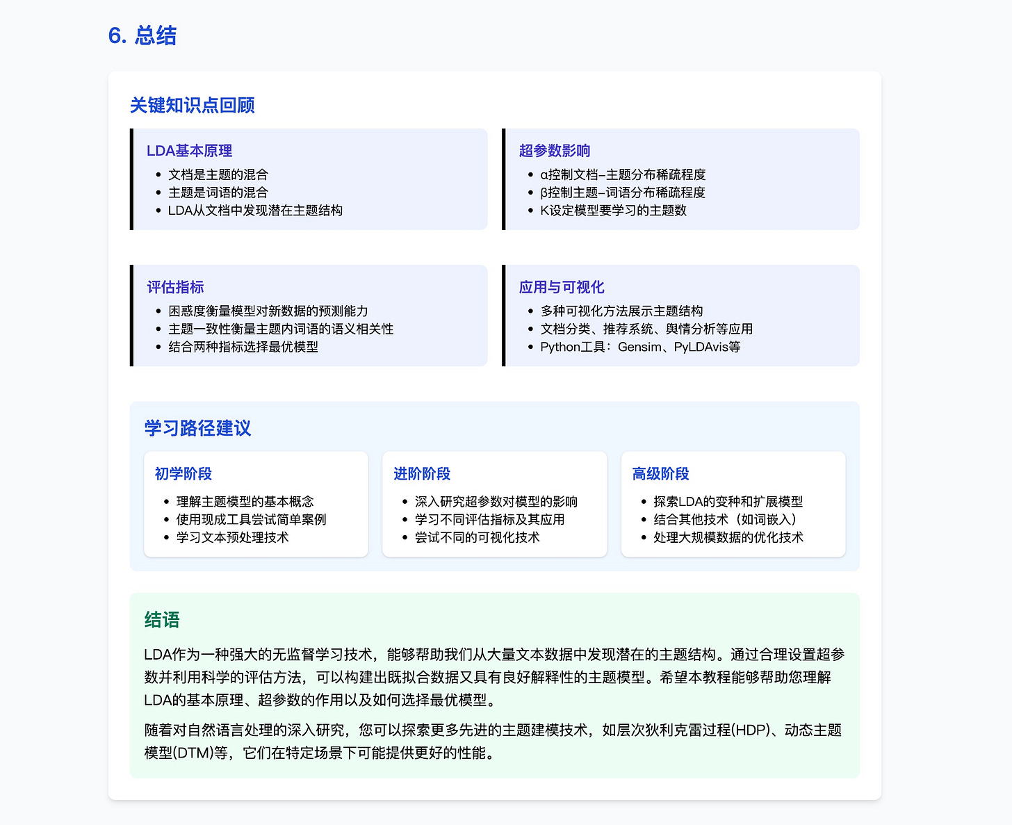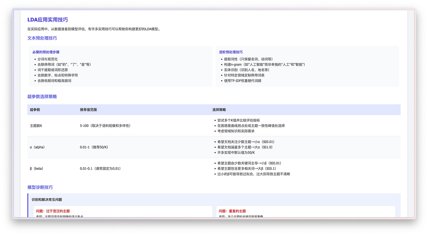 最后,它列举了 LDA 的几个实际应用场景,比如文本分类、推荐系统、舆情分析和文献主题演变分析等等,甚至还贴心地附上了一些 Python 代码示例,鼓励你立即上手尝试。