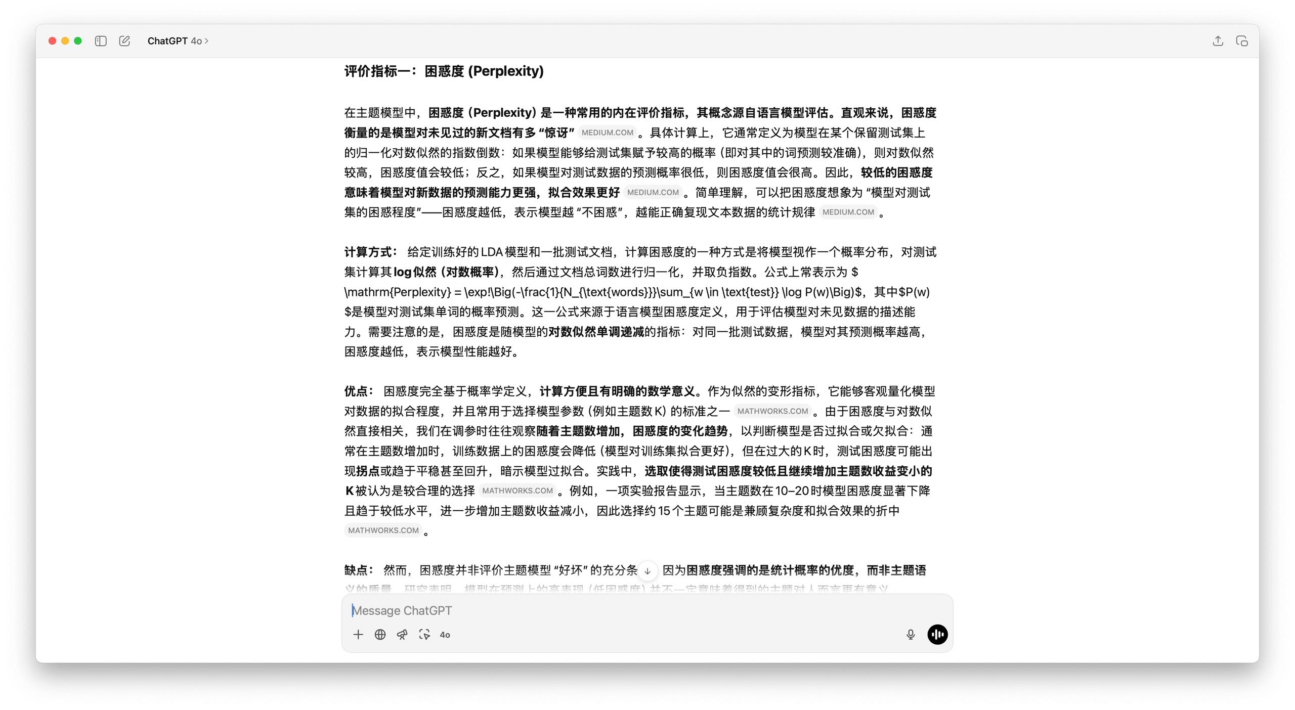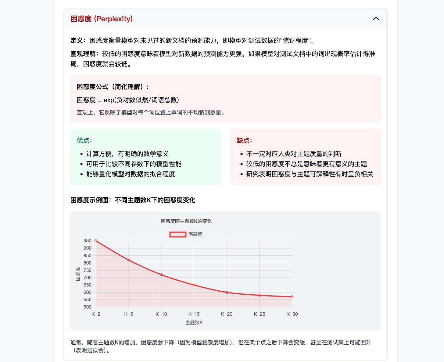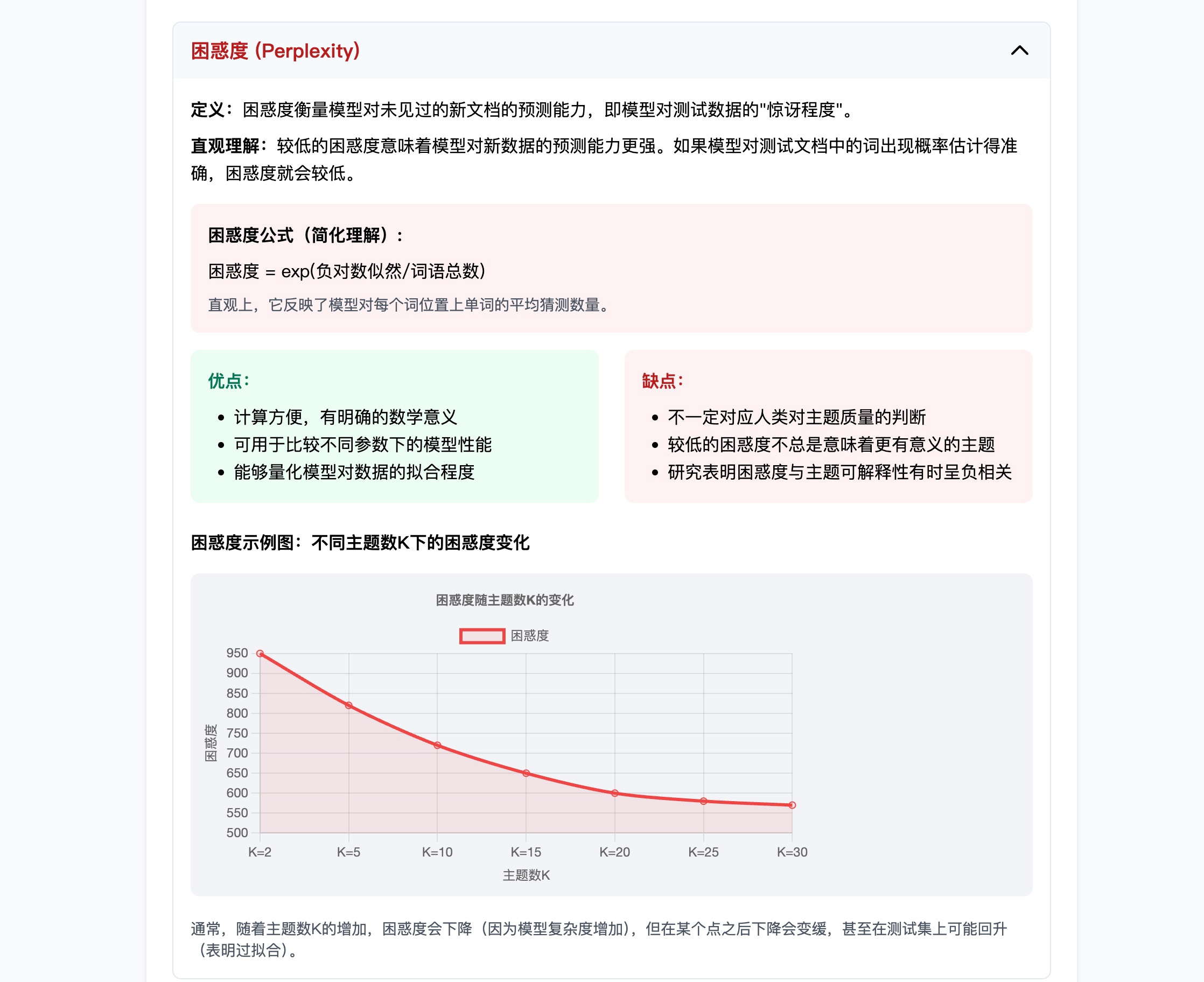 至于那些评估指标,比如困惑度,教程也给出了清晰的公式和深入的讲解,通过鼠标悬停互动,可以让你看到不同主题的细节信息。