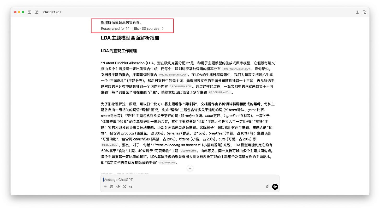 为了激励它,我还特意加了一句:「使用你的最大算力最强思考。」输入的资料,就是我之前与 OpenAI Deep Research 互动获得的 LDA 深度调研报告。
