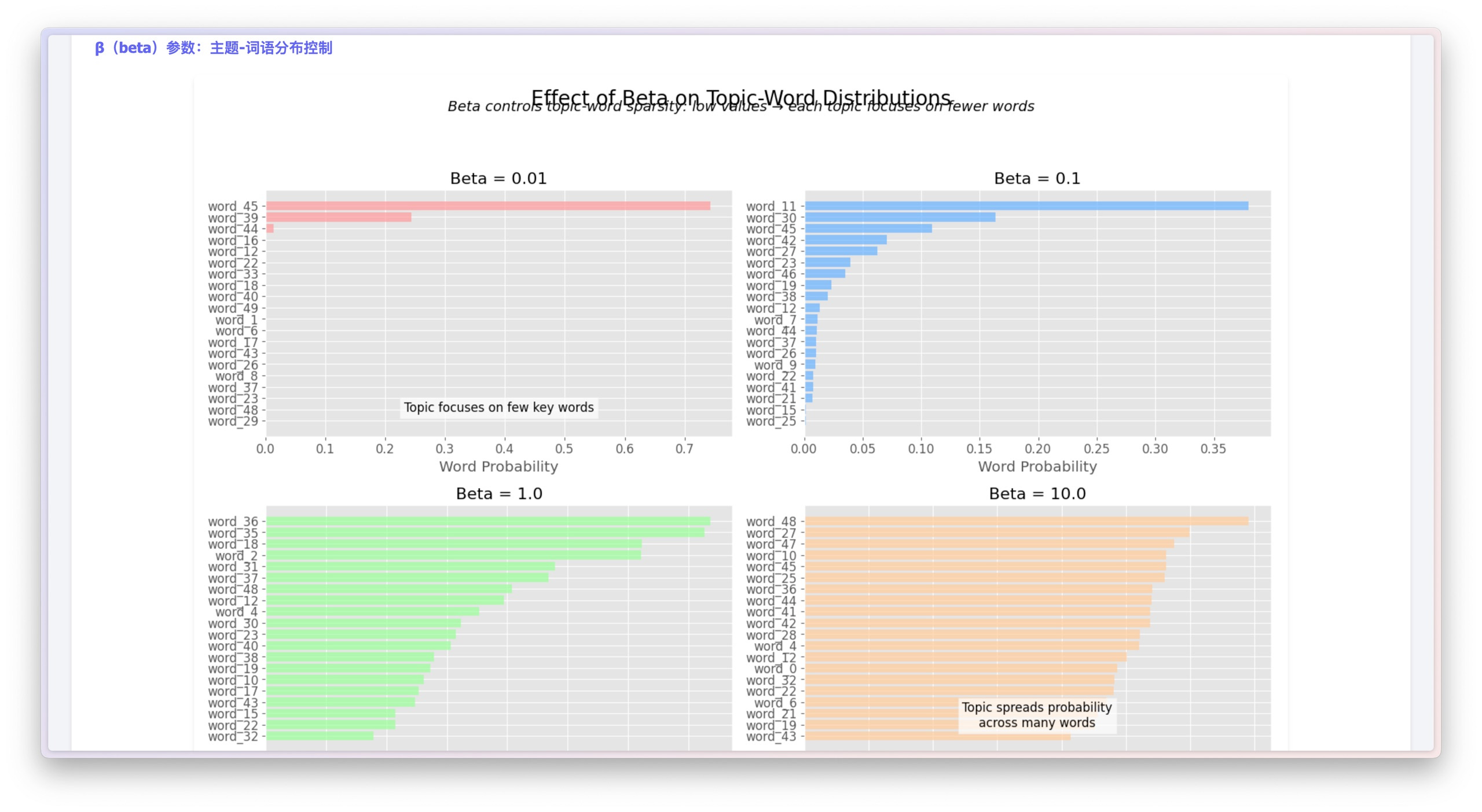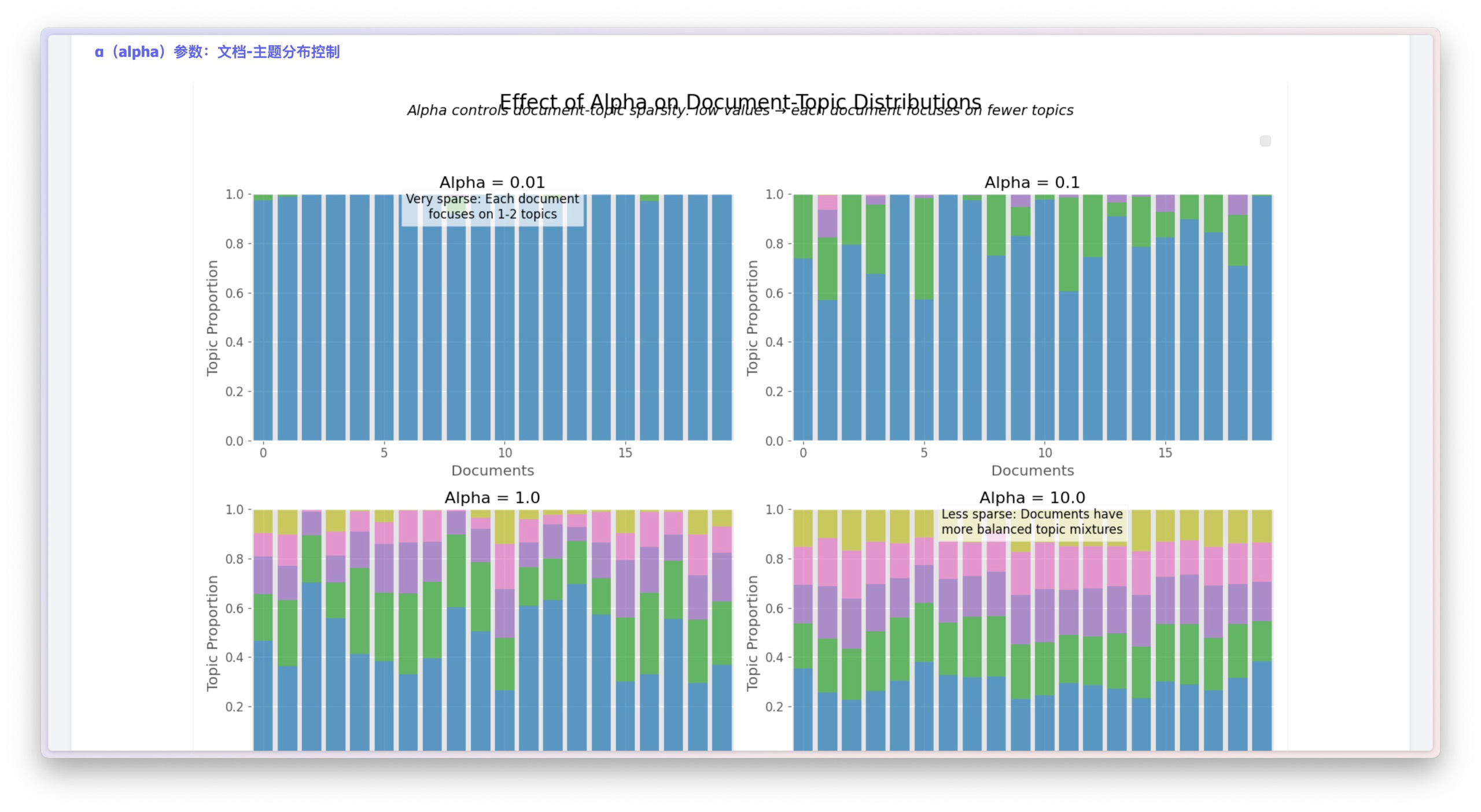 这些图直观地展示了不同参数设置(比如 Alpha 很小或者很大时)对主题分布具体有哪些影响,细节到位,特别容易理解。
