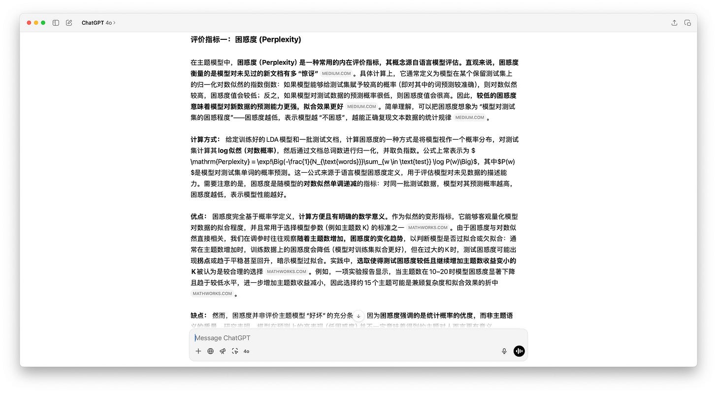 这个模型在文本分析中非常有用,但里面有些术语真的让初学者摸不着头脑。比如说,有个叫「超参数」的东西,里面包括主题数量 K 值、Alpha 和 Beta 等参数,还有模型评估指标,比如困惑度(Perplexity)和主题一致性(Topic Coherence)。乍听起来挺高级吧?其实它们都有明确的定义可以遵循和计算。但要真正理解它们,还是得下些功夫。