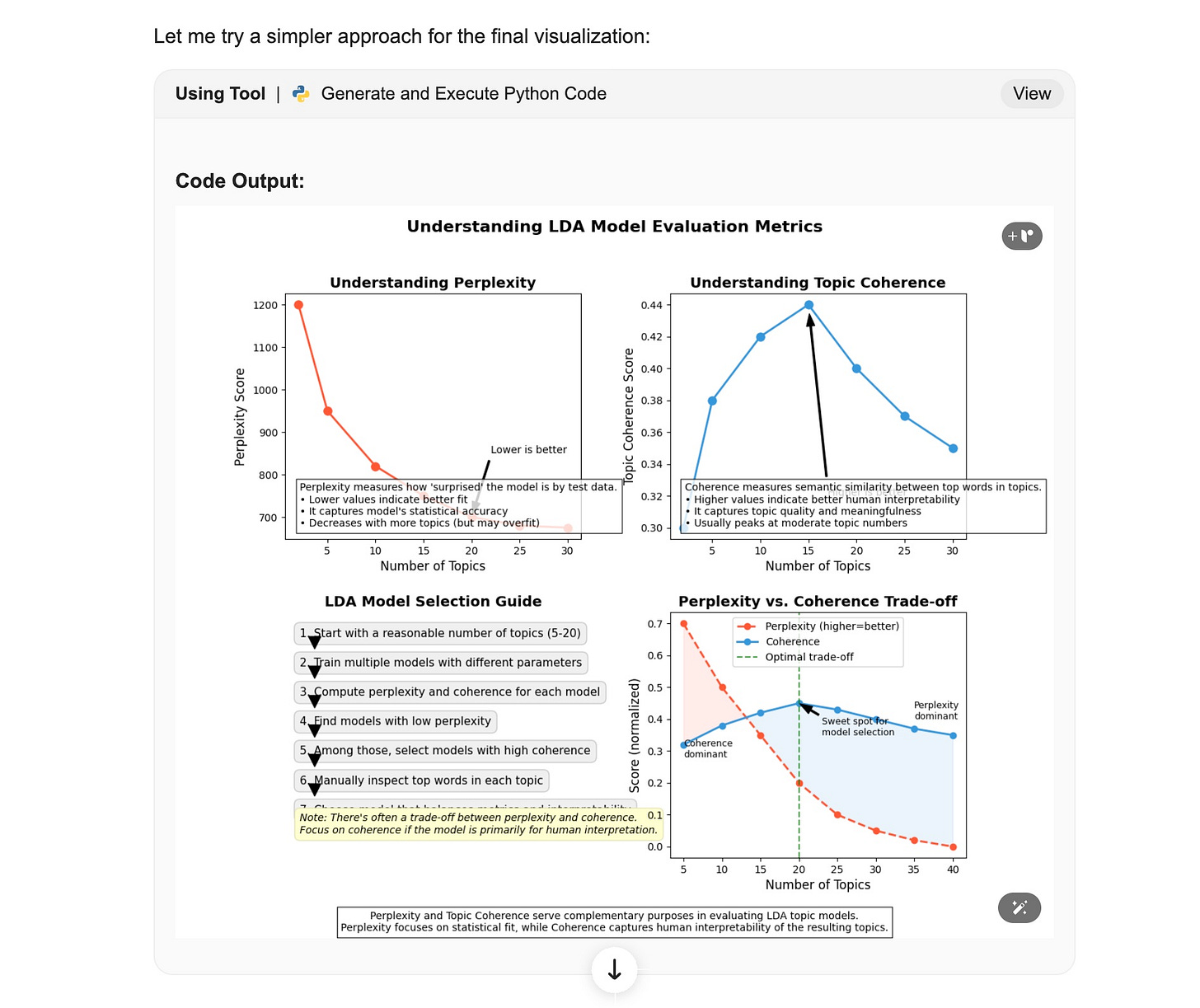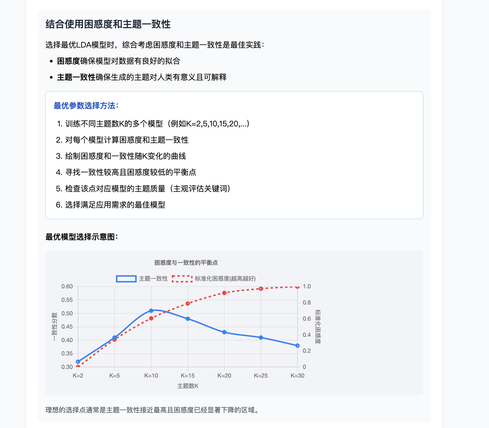 教程甚至还告诉你如何综合使用这些指标,挑选出最佳的主题数量 K 值,并给出实际案例,让你清楚地看到不同参数下的差异。