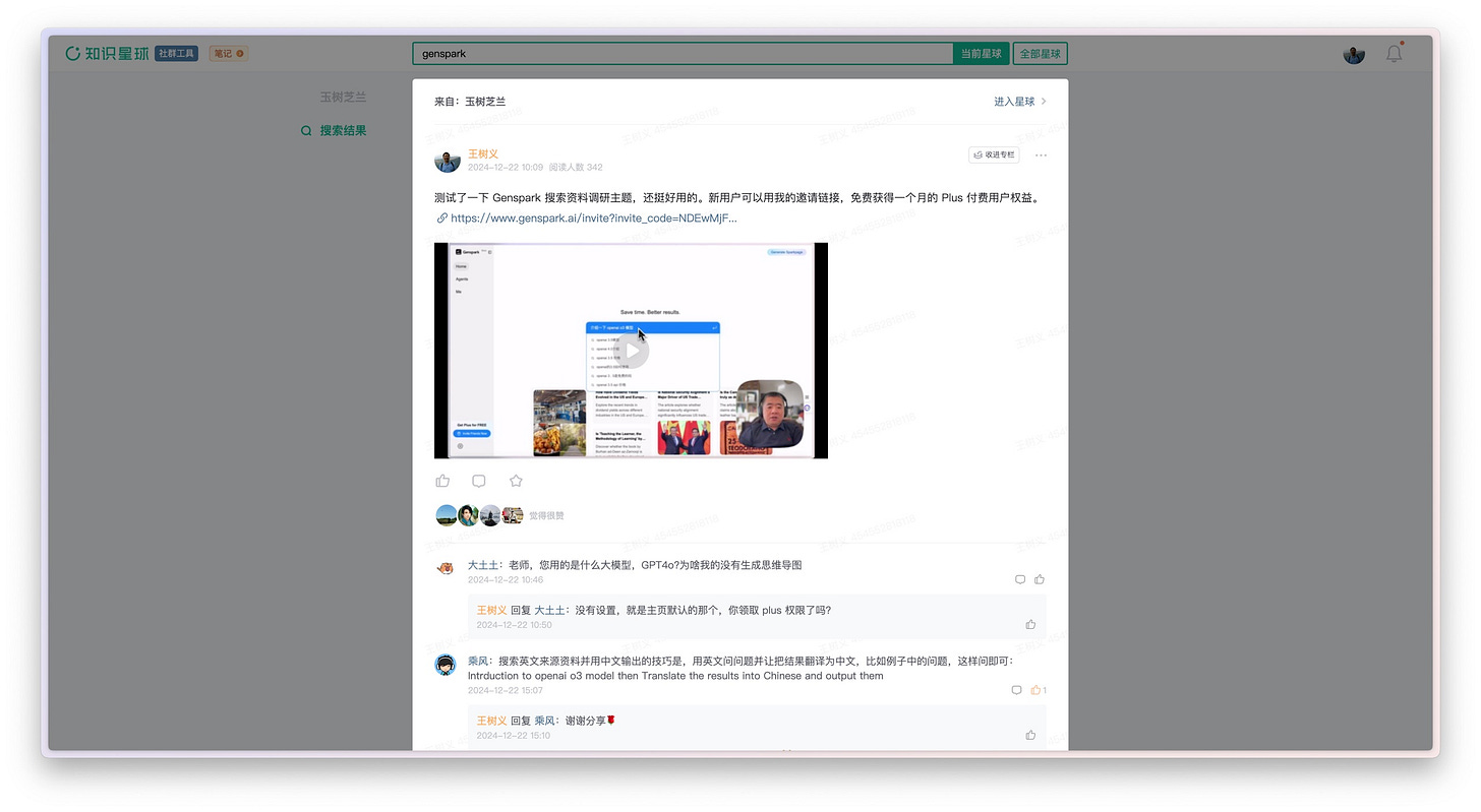 我在看这个新闻的时候,觉得这个名字有点儿眼熟。翻资料才想起来,我第一次接触 Genspark 还是去年(2024 年)12 月份。当时我还专门为我的知识星球用户录制了一个介绍视频。
