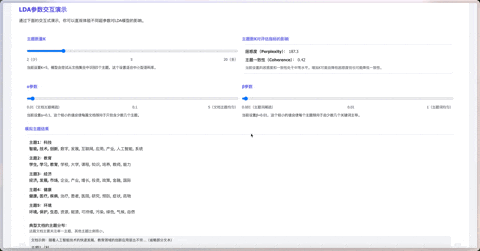 最酷的还要数实时交互演示的部分。你直接在网页上调整主题数量 K、Alpha、Beta 参数,下方的主题词分布、文档主题分布图表都会立刻发生变化,同时实时显示对应的困惑度和一致性得分。