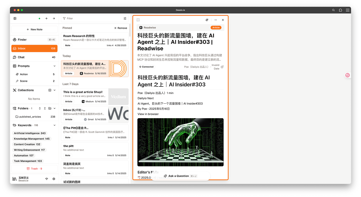 当时我提到,Dessix 能够帮助人与 AI 实现上下文的聚焦同步,从而让你能更便捷、准确地利用上下文信息来解答疑问、搜寻资料。那时,我对这款工具的探索尚浅,便在文末和你说好,待日后深入体验,再与你细细分享。