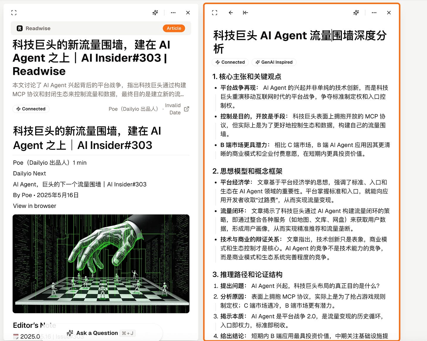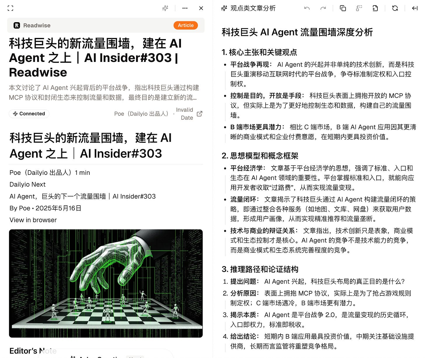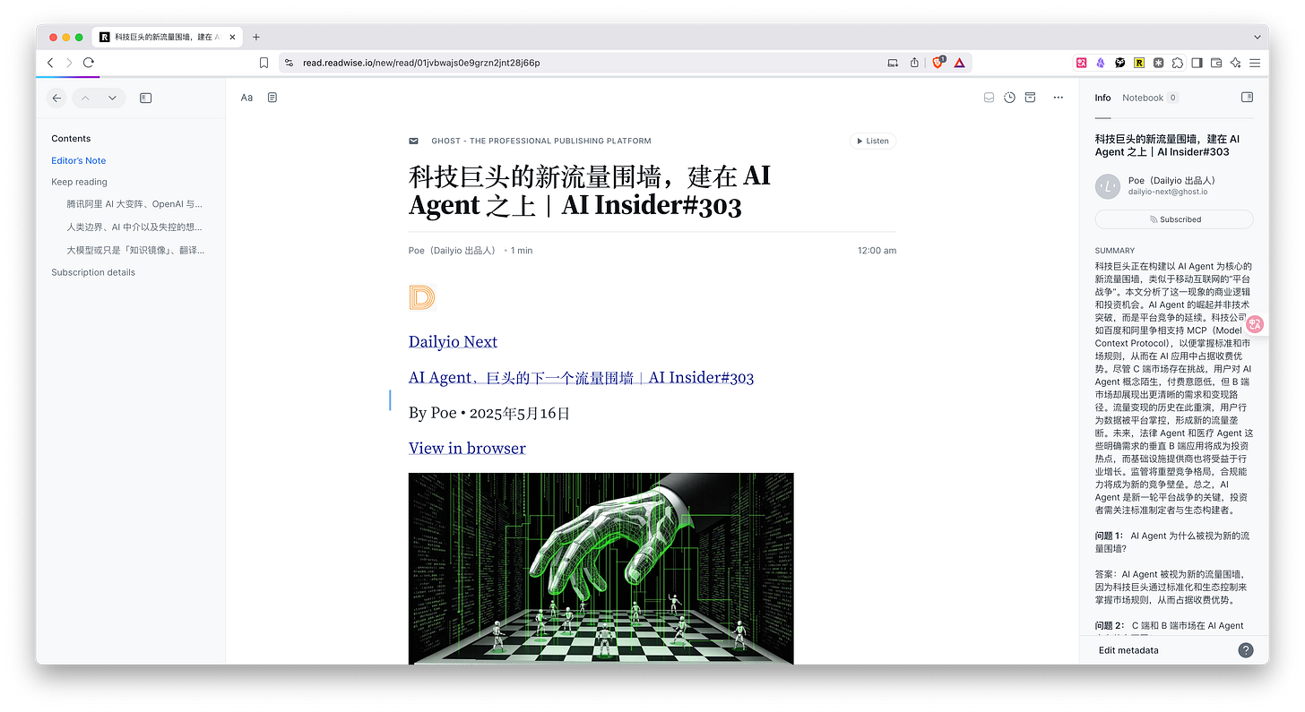 我选用的外部信息输入材料,是赵赛坡先生最新一期的 AI Insider,主题是「科技巨头的新流量围墙,建在 AI Agent 之上」。