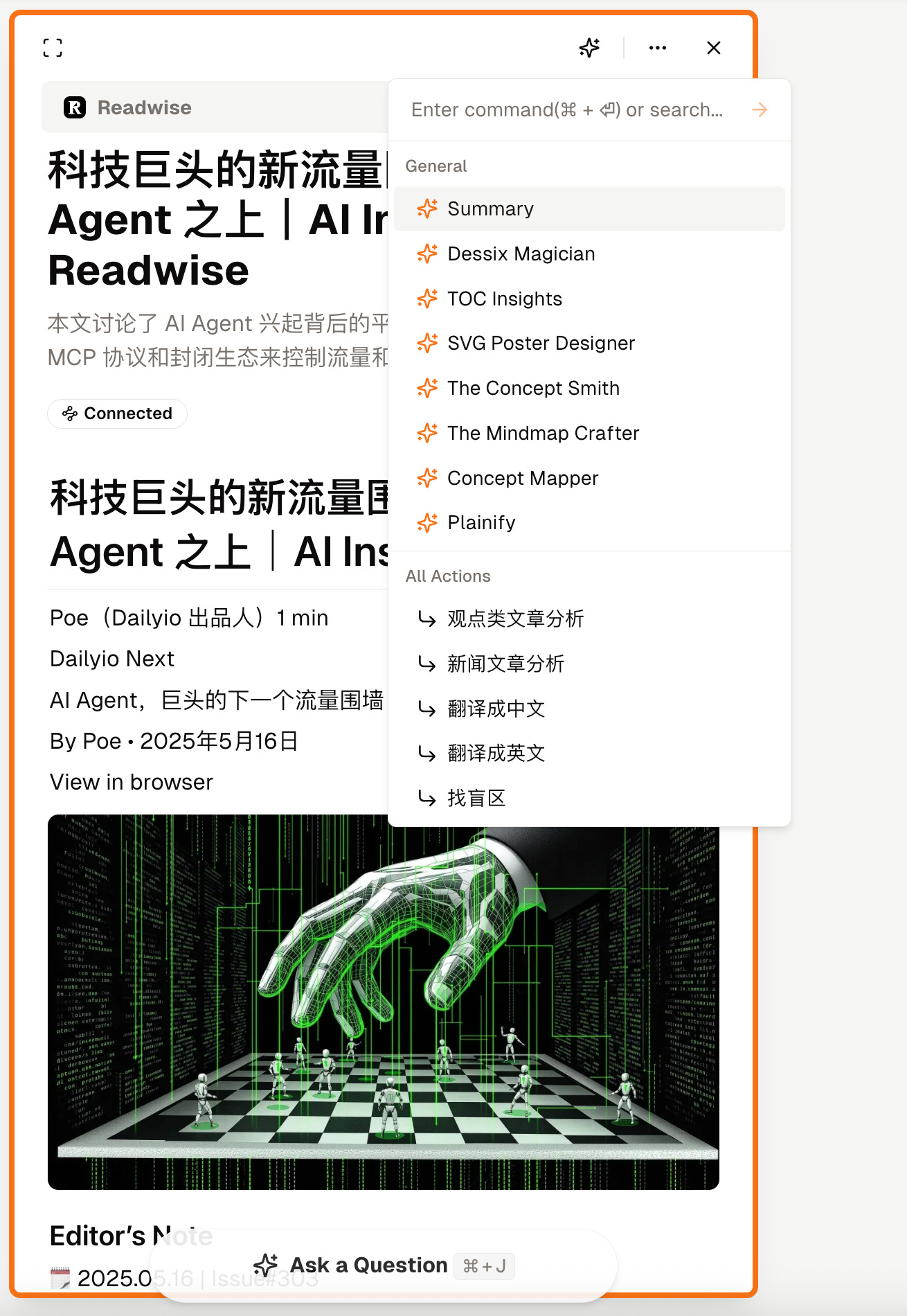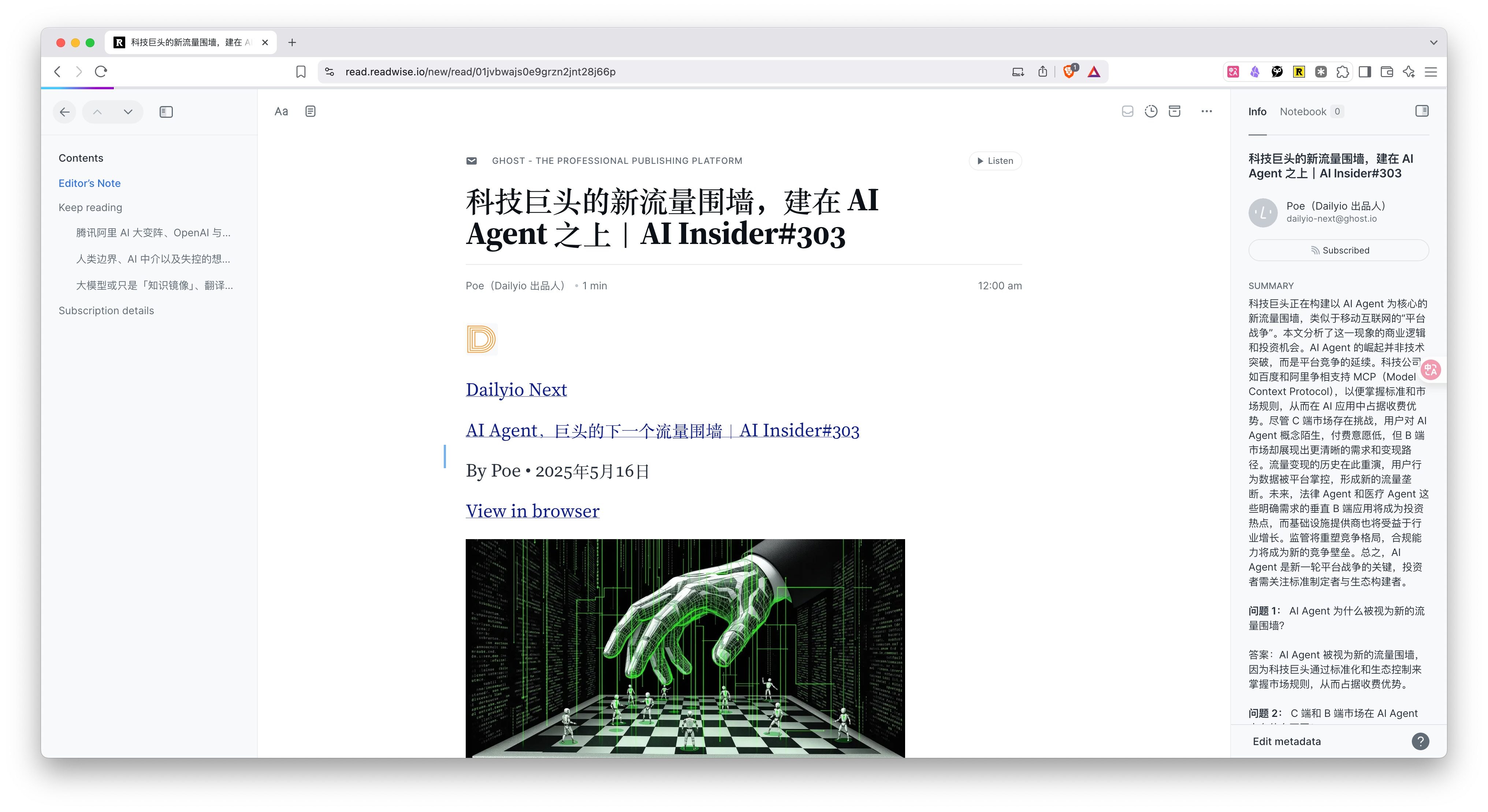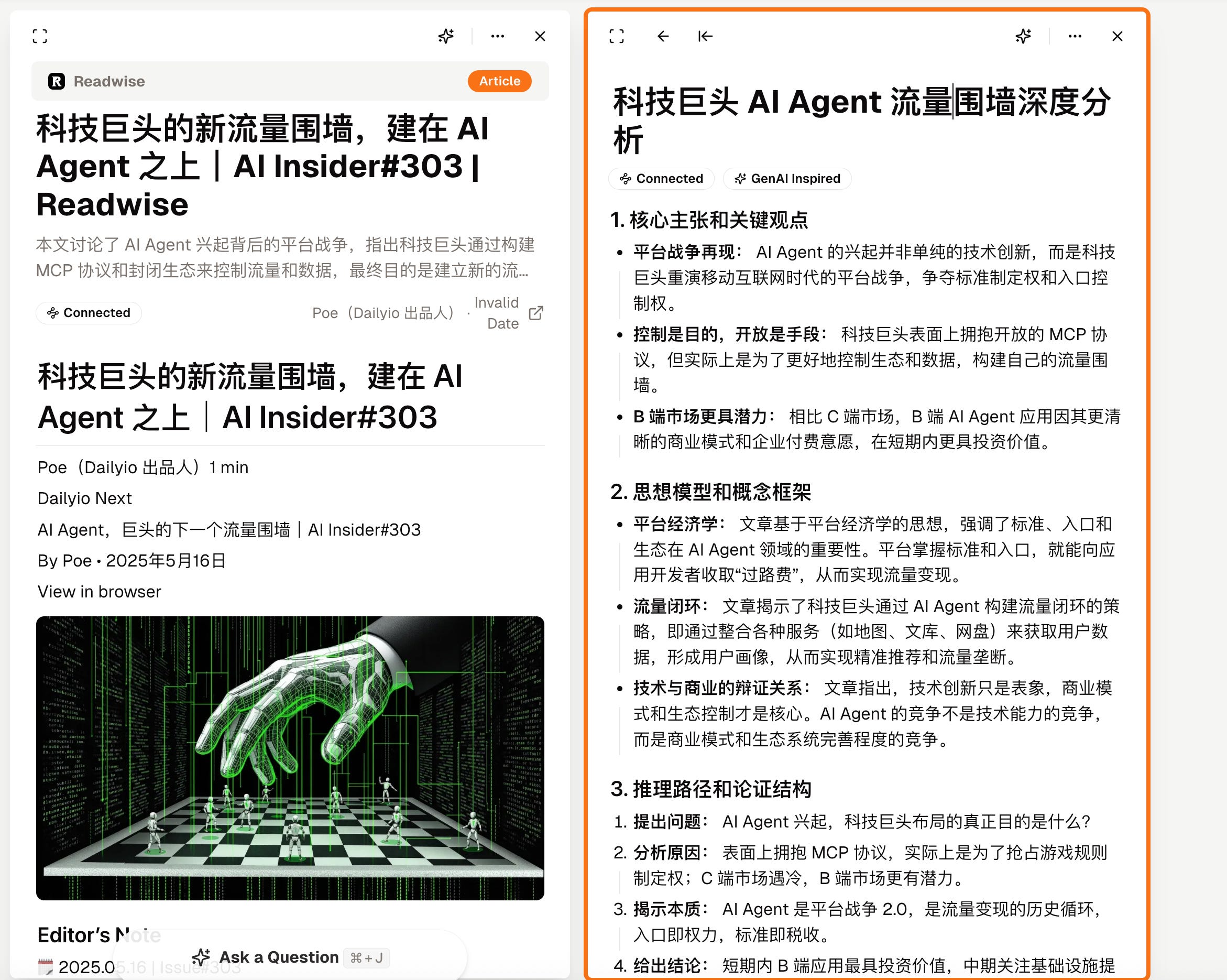 我选用的外部信息输入材料,是赵赛坡先生最新一期的 AI Insider,主题是「科技巨头的新流量围墙,建在 AI Agent 之上」。