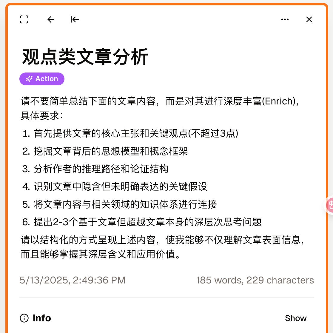 我在这里选择的是「观点类文章分析」这个 Action。这是我从赵赛坡先生那里习得的一个提示词。内容如下图所示。