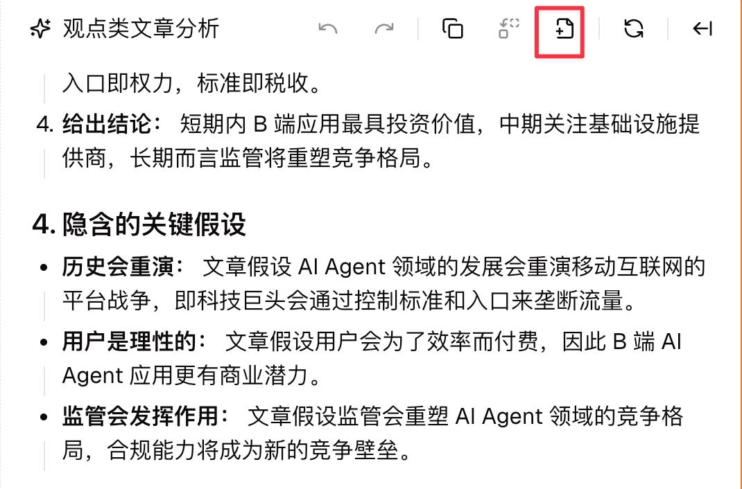 紧随其后的是「隐含的关键假设」分析,这一点非常有意思,因为它实际上是在尝试对齐读者与作者的认知。如果读者的预设与作者的假设不同,那么对文章的理解自然也会产生差异。这种方式有助于我们更清晰地洞察作者的真实意图,特别是可以找出那些我们感觉有问题却又难以名状的症结所在。