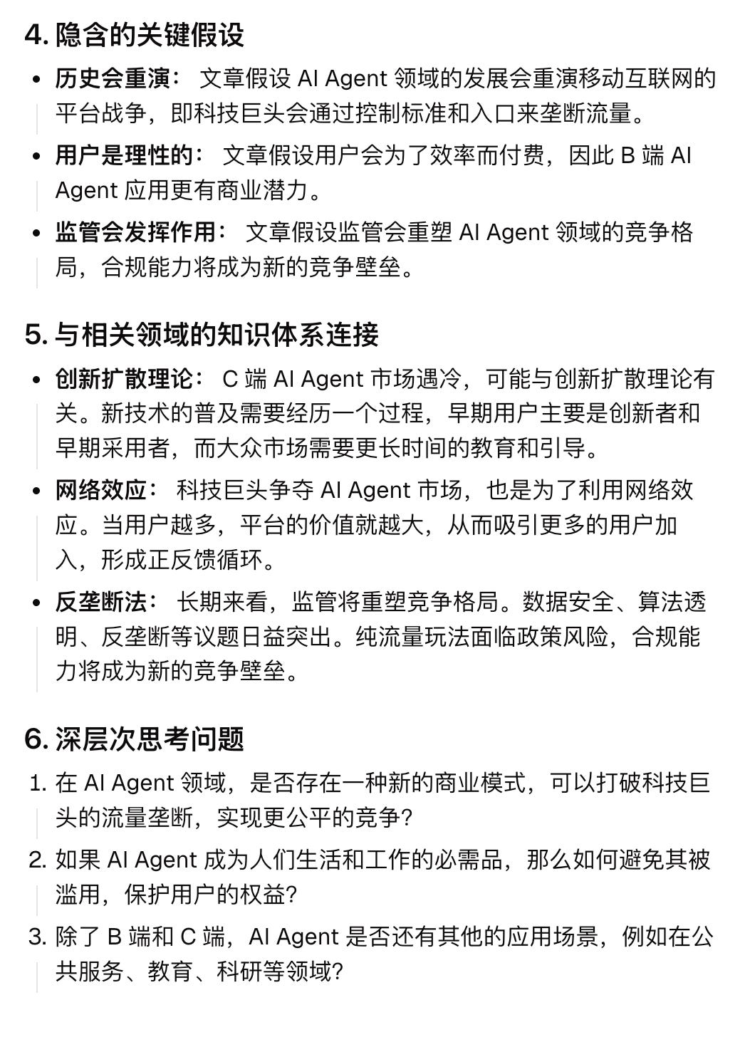 更进一步,它还提出了一系列引人深思的问题,例如「在 AI agent 领域是否存在新的商业模式,打破科技巨头流量垄断,实现更公平的竞争?」这些并非直接给出答案,却能有效激发我们进行更深层次的思考。