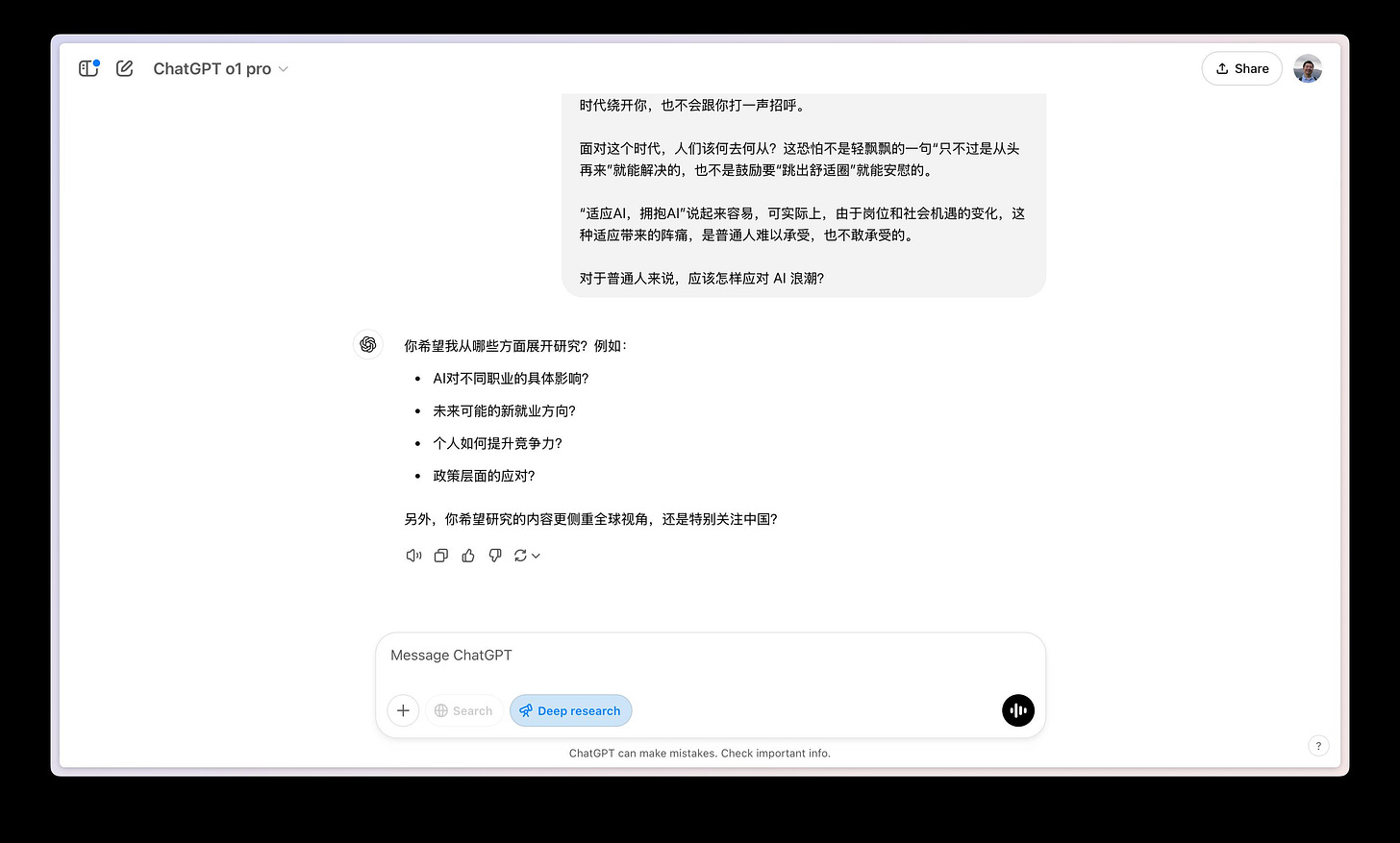 后来驱动 OpenAI Deep Research 的 o3 模型被单独作为一个产品拿了出来,放在 ChatGPT 里面供我调用。我用了几天,立即就把 Plus 升级到了 Pro 。因为我发现,Plus 给的 o3 额度(每周 100 次)根本不够用。