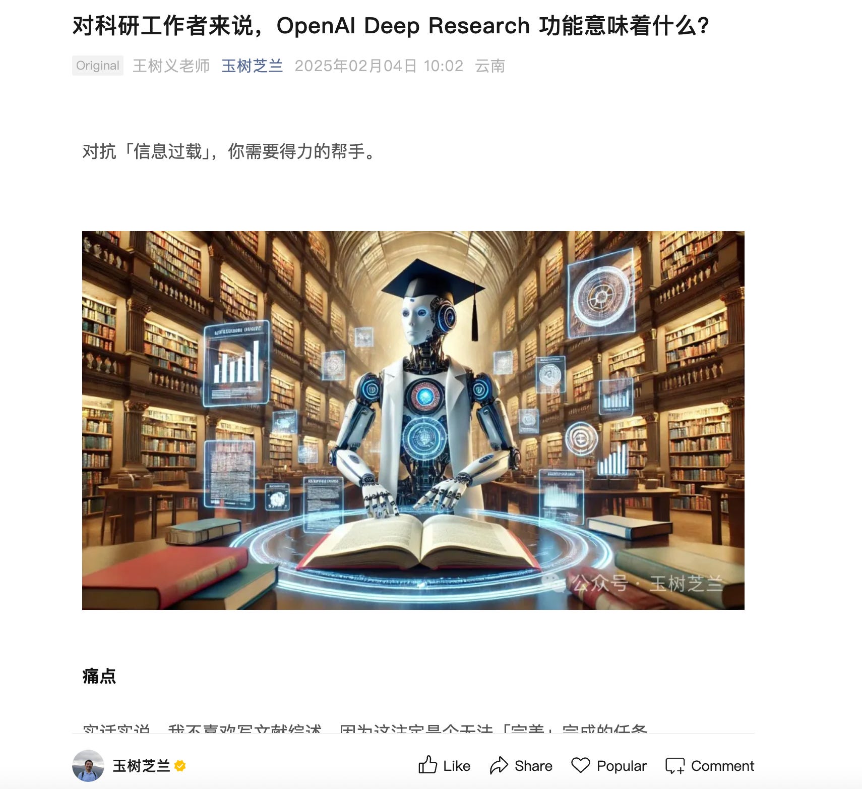 自从 ChatGPT 推出 OpenAI Deep Research 模式,我就很兴奋。我跟你提过,那一天早上,我直接放弃了洱海荡舟,而是坐下来写完了一篇《对科研工作者来说,OpenAI Deep Research 功能意味着什么?》