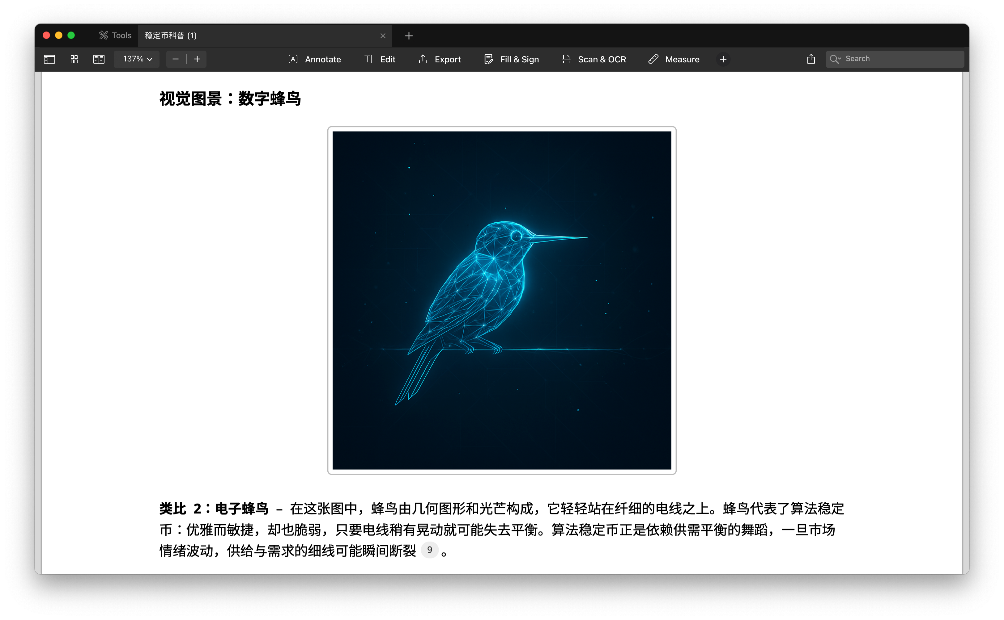 后文这个描摹算法稳定币的「数字蜂鸟」也挺好,它比喻了算法稳定币的精巧与脆弱性。
