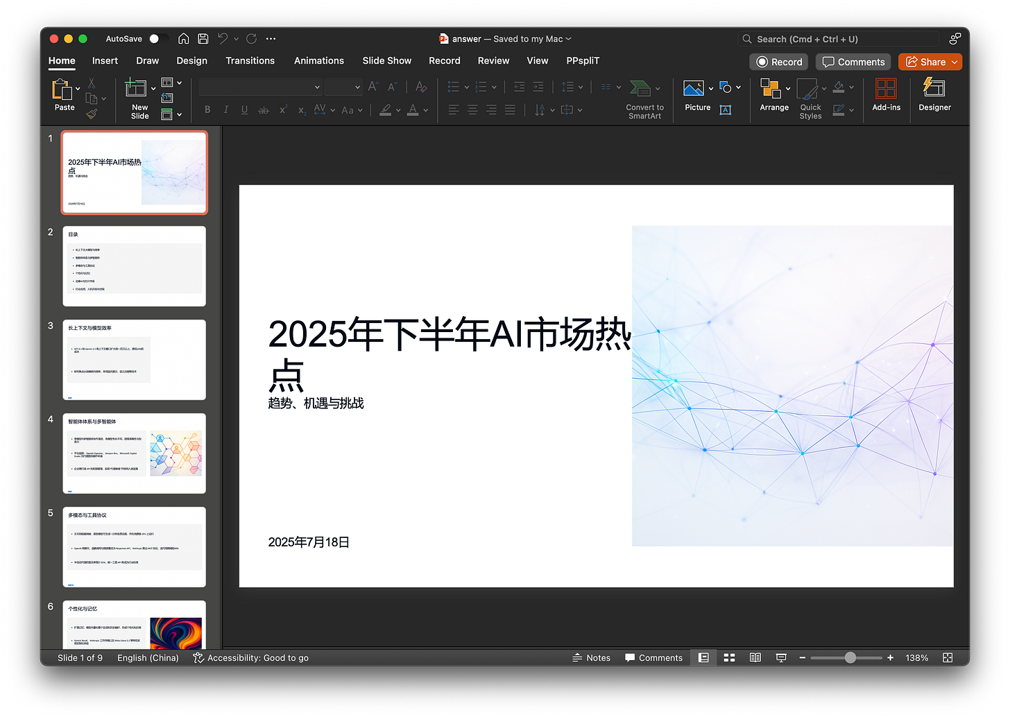 你甚至可以把内容展现形式也一股脑交给它执行。例如让它在行文中做个图表,或者干脆,把结果用 PPT 形式呈现。