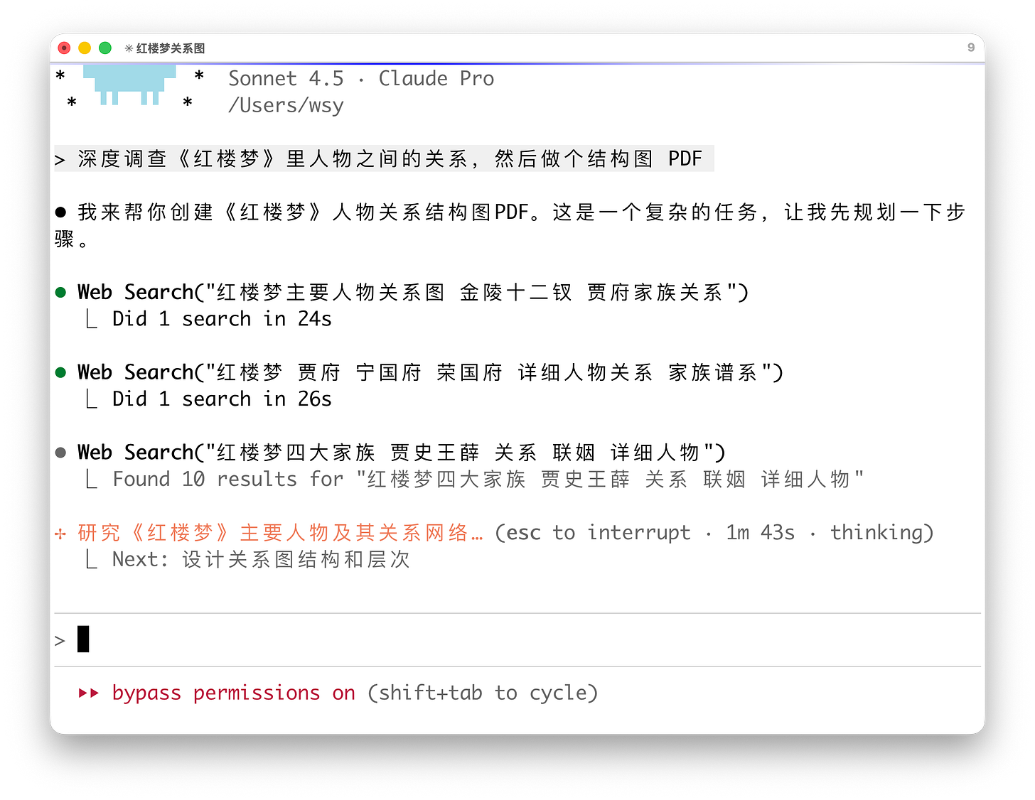 它先是启动了 WebSearch,第一轮搜「红楼梦金陵十二钗名单」;紧接着第二轮搜「宁国府荣国府谱系」;它发现贾母娘家是史侯,又去搜「四大家族联姻关系」……