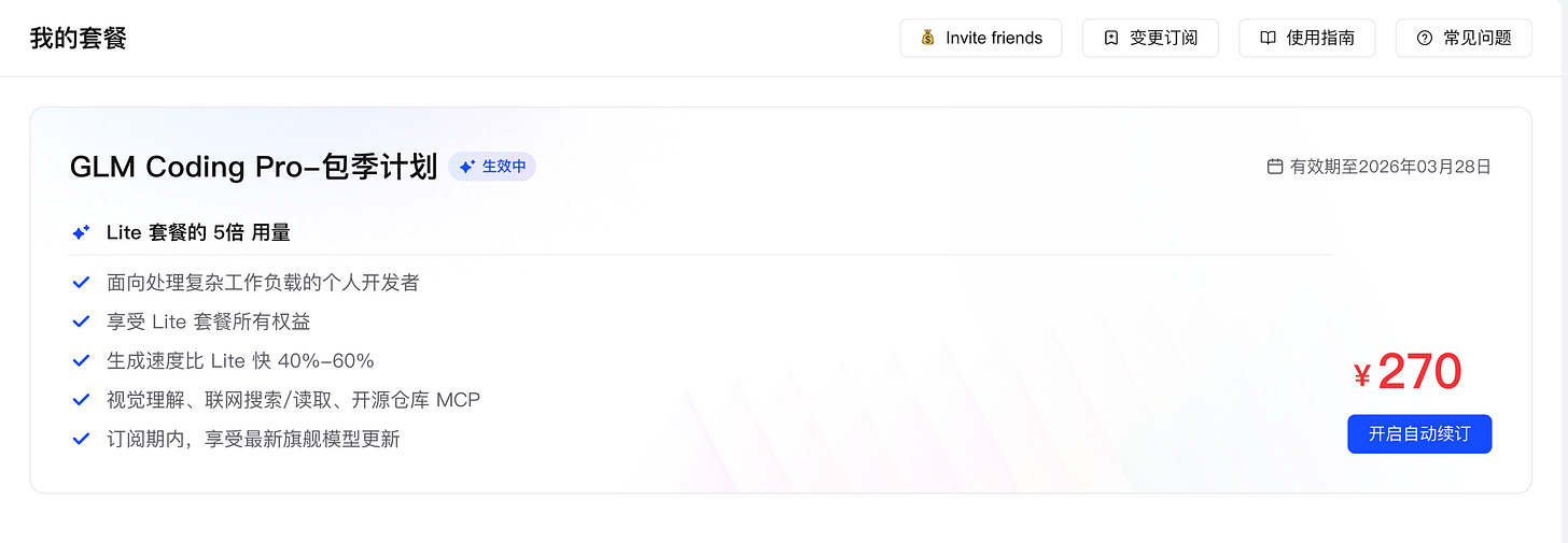 如果你轻度使用的话,用不着采用 Pro 这个级别的订阅。智谱 Lite 给的额度已经够用。