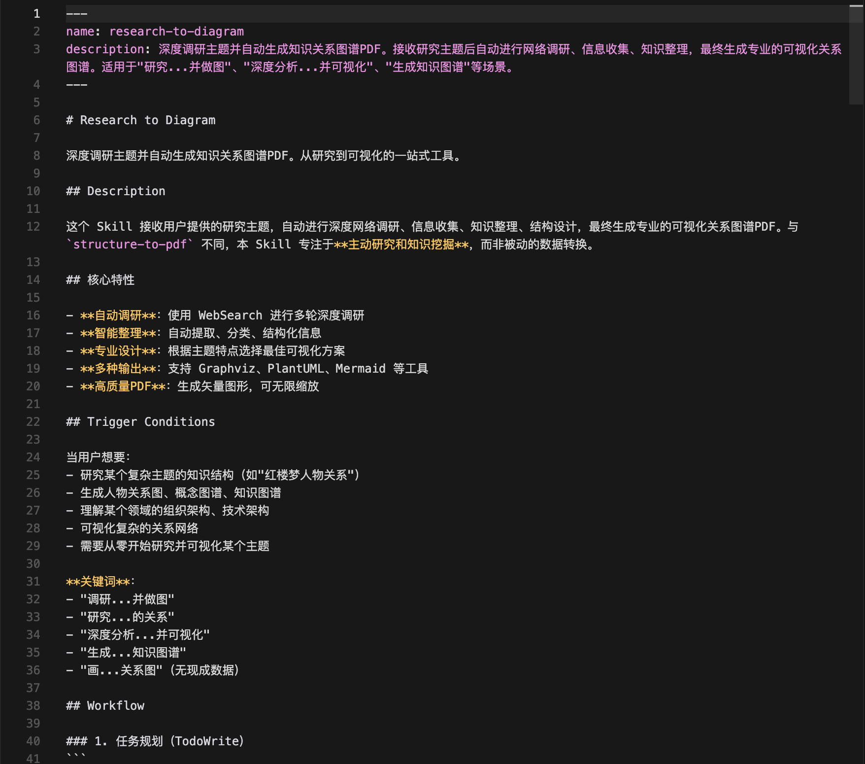 不需要什么复杂的配置,在 Claude Code 里,只要你的指令里包含「深度调查」、「研究…… 并生成图谱」或者「画…… 关系图」这些关键词,它就会自动触发。