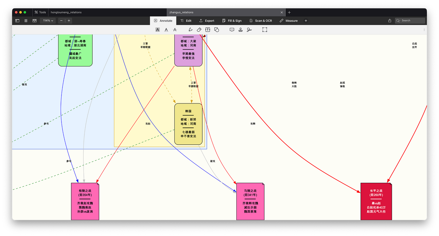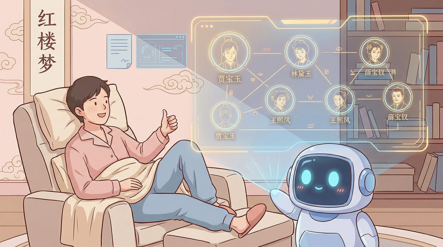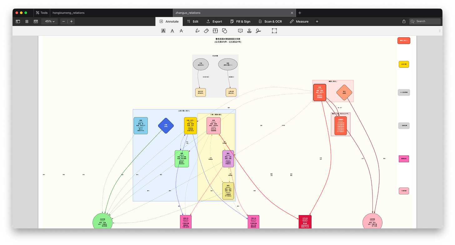 当你把搜索、整理、绘图这些繁琐的认知负荷(Cognitive Load)都卸载给工具之后,你的大脑就能腾出空来,去思考《红楼梦》里家族兴衰的深层逻辑,去分析战国七雄背后的地缘政治。
