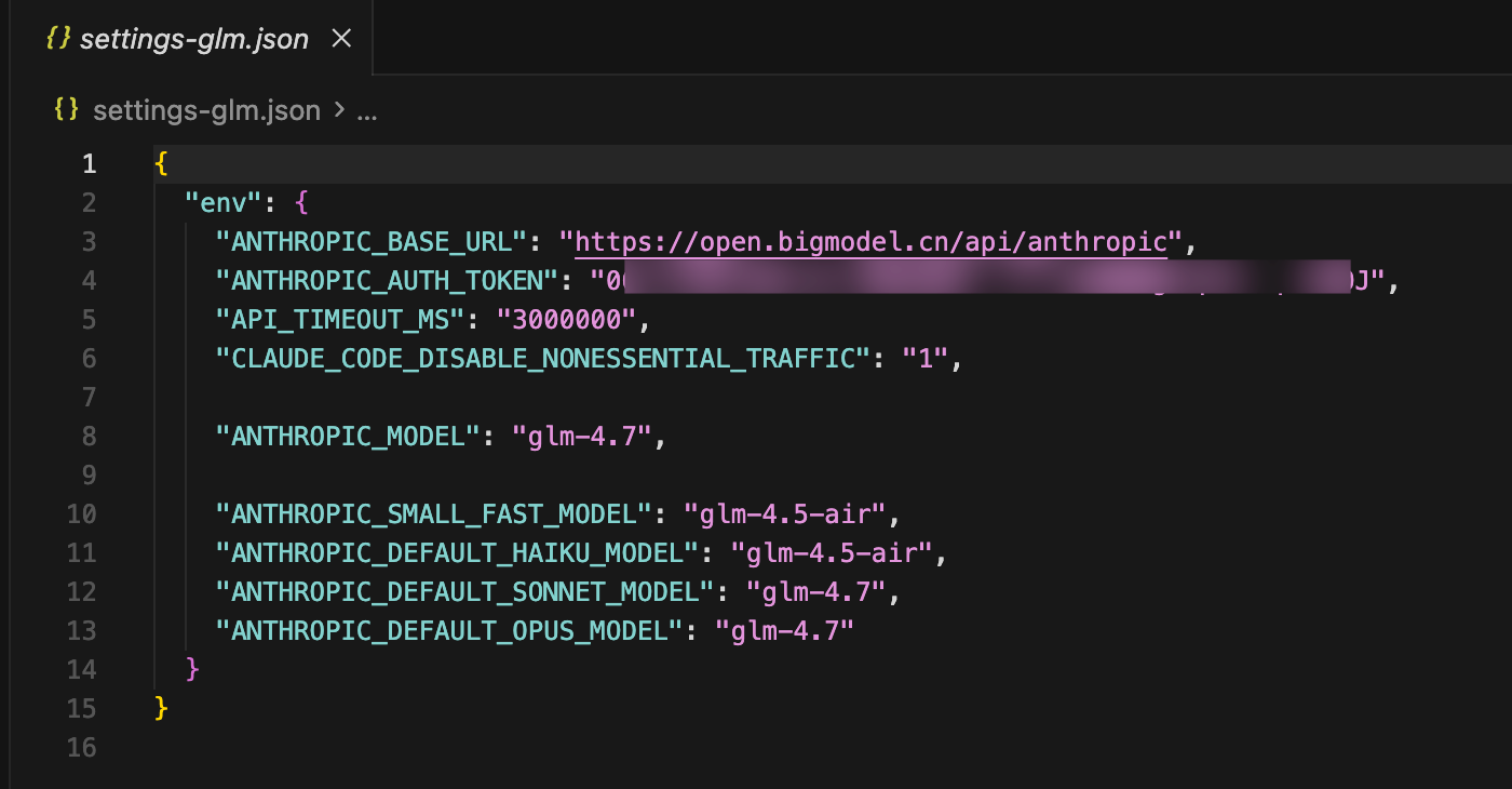 之后,你可以在 ~/.claude 这个文件夹下面建立一个 settings-glm.json 文件。