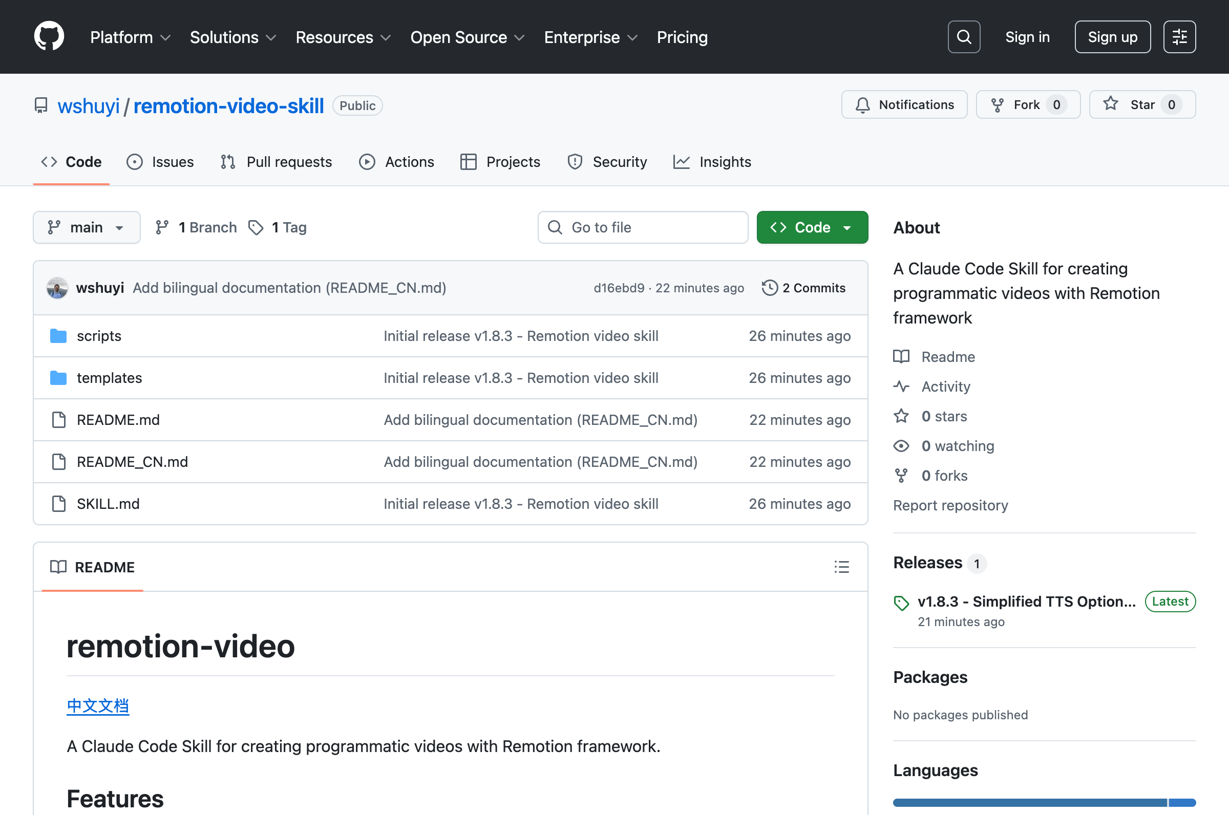 网址为: **remotion-video-skill**(https://github.com/wshuyi/remotion-video-skill)