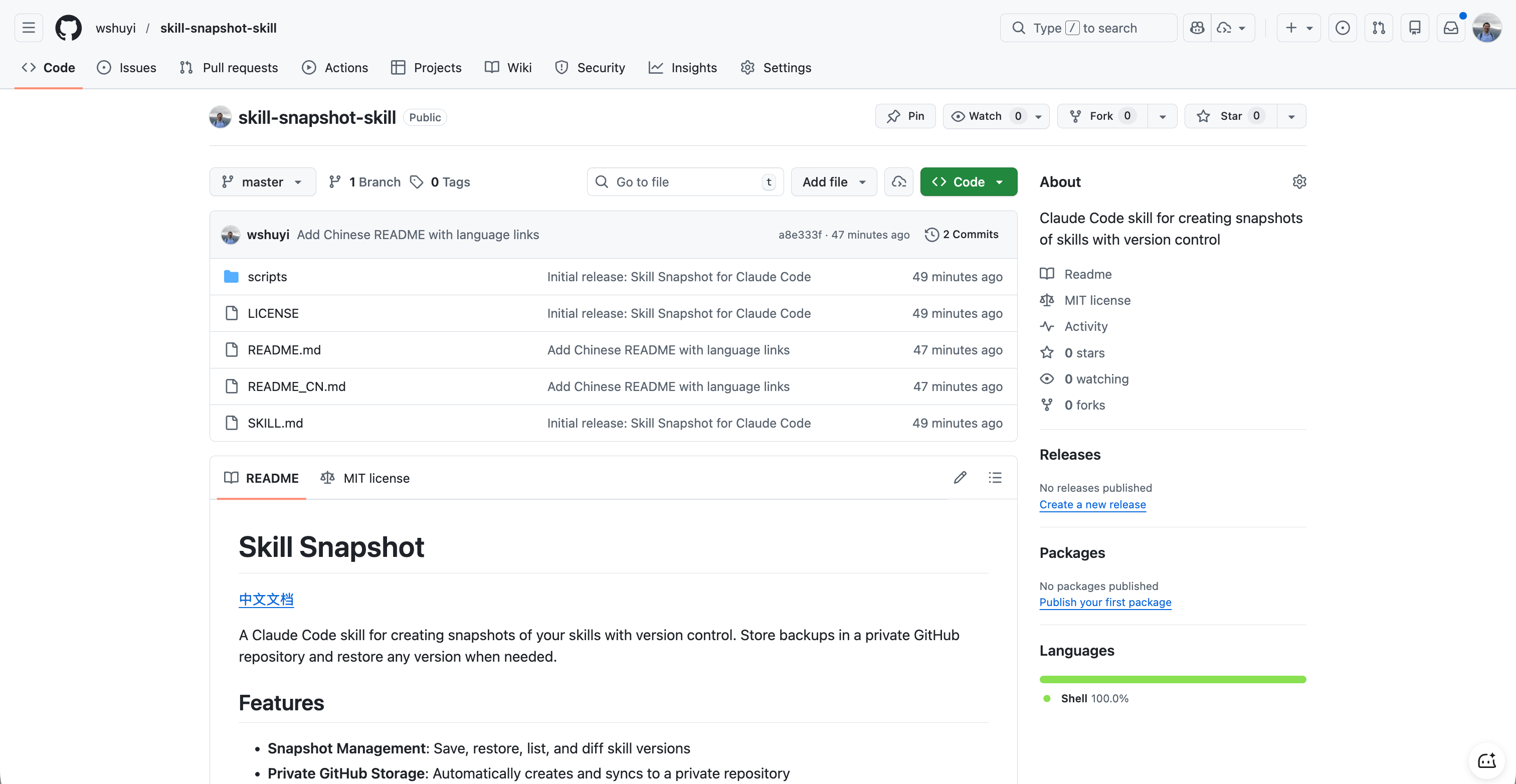 发布完成。公开仓库地址:github.com/wshuyi/skill-snapshot-skill。你可以直接点击查看。